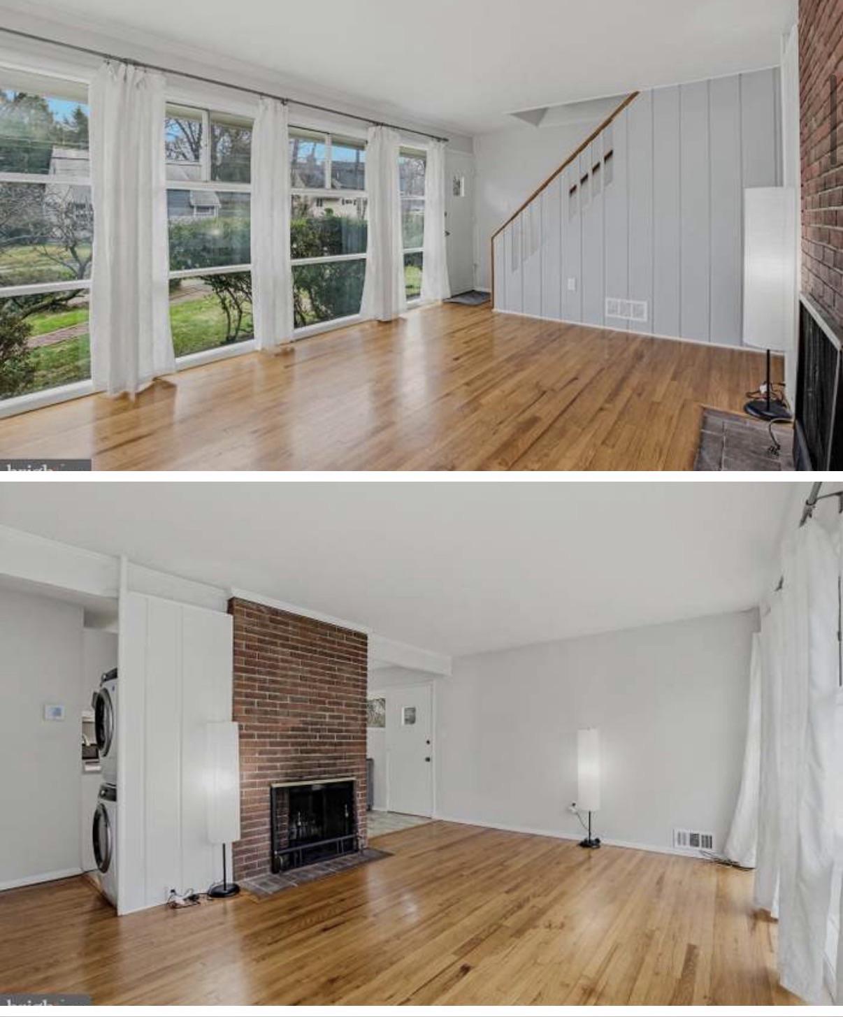 I may be a minority, but I like the wide paneling on the stairs and the wall by the fireplace.