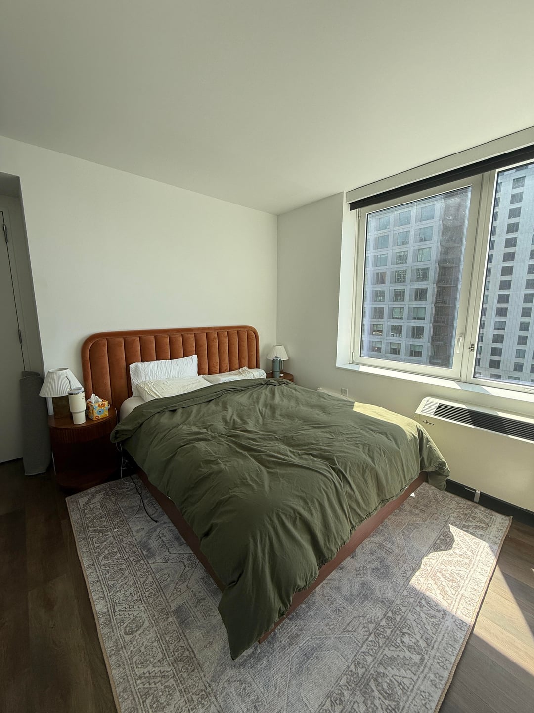 Gotta ditch that rug. It’s a fine rug, and it’s teh right size, but with the cool terracotta bed and deep olive bedding, the current rug looks like it doesn’t belong, and it brings down the vibe. It’s pale and faded and colorless and your bedding if warm and vibrant.