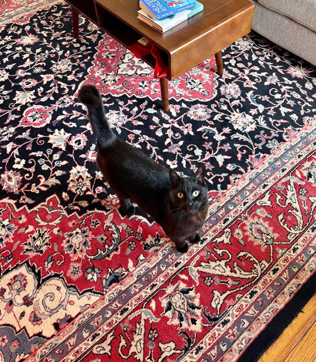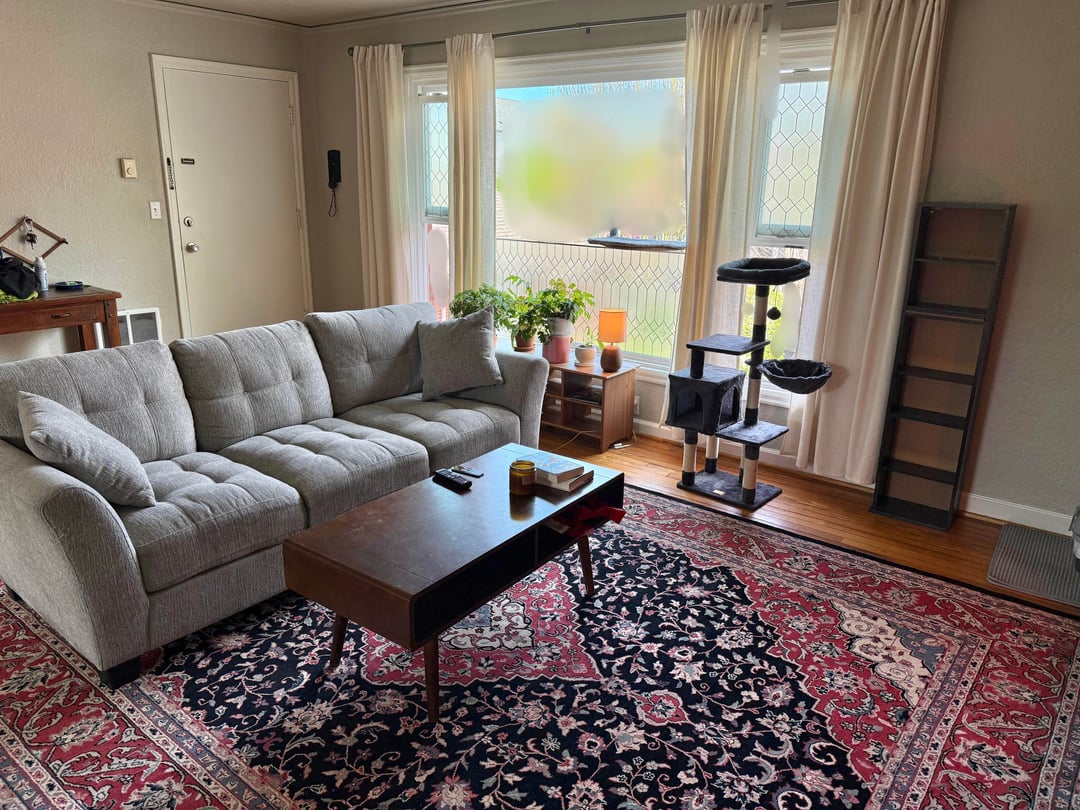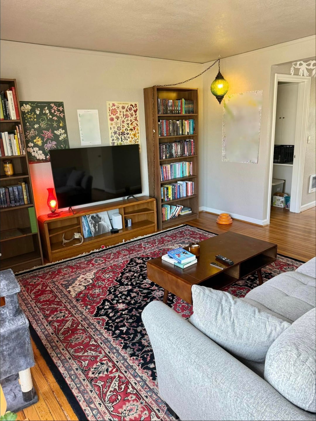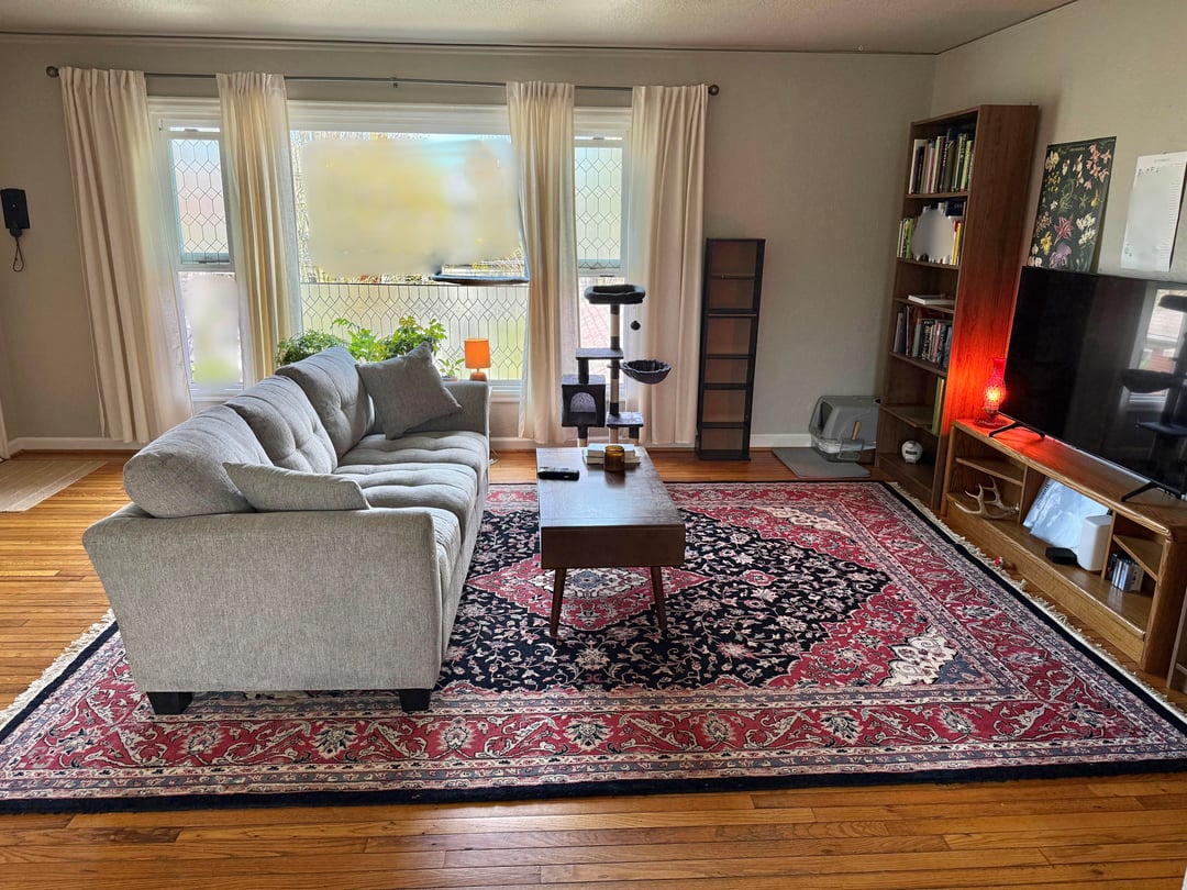 I got this beautiful handwoven Persian rug for $150 (!!) on Marketplace and am having mixed feelings about it. Does it work in our space? Is it too big? *I can’t rotate it the other way* because it has a large patch of discoloration that needs to be hidden by furniture, so this is the only way it can go. Is it too busy? How can I make it more cohesive? Any and all (kind) suggestions welcome 🙂 Only moved in a couple of months ago so still working out the space.