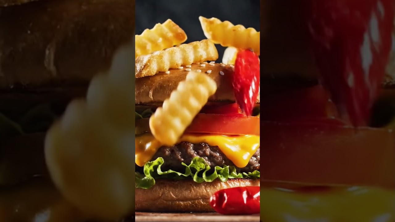 Watch this juicy gourmet burger paired with a satisfying slow-motion fries drop! 🍟 Perfect crispy texture, mouthwatering visuals, and ultimate food vibes in one short. Don’t miss this delicious moment!