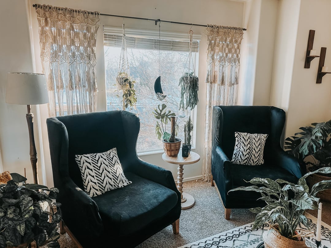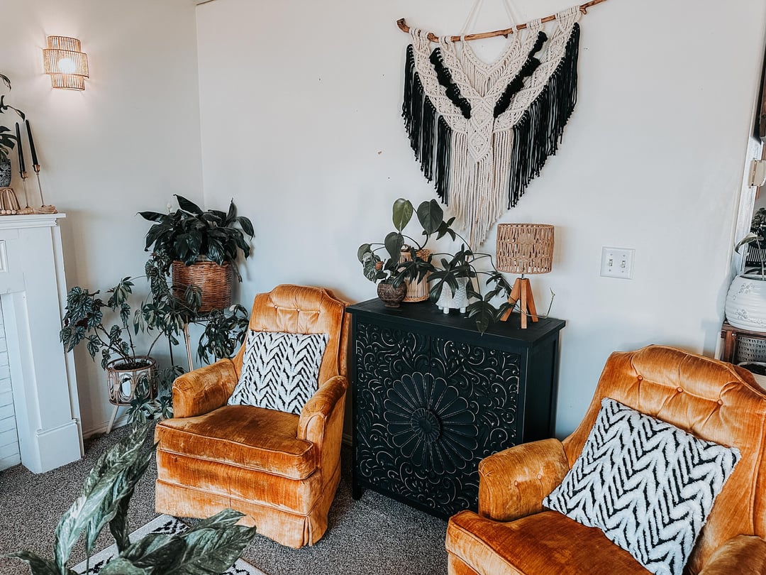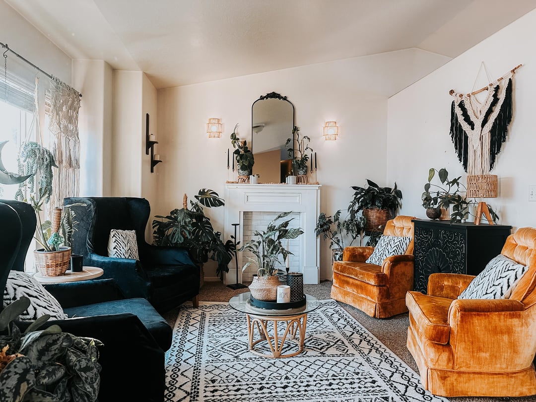 I built this space around my grandmother’s velvet chairs that I inherited last year. Everything else kind of grew from there. So happy with how it came together! PS, don’t judge the dog hair, we love our husky and he loves to lay in the chairs and look out the window. 😝