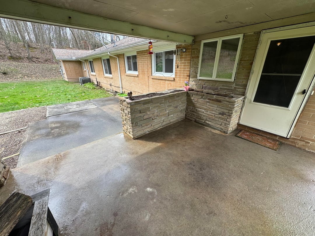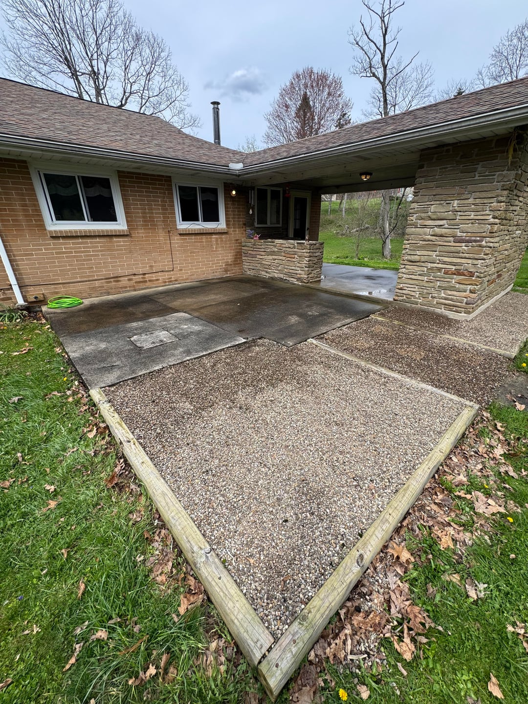 AI came up with this. The pergola would be a bit pricey, but I think adding lights along your patio roof would be pretty. Swap out the fire pit for a table, and I like the bar addition. You could have a patio table and chairs under the roof as well.