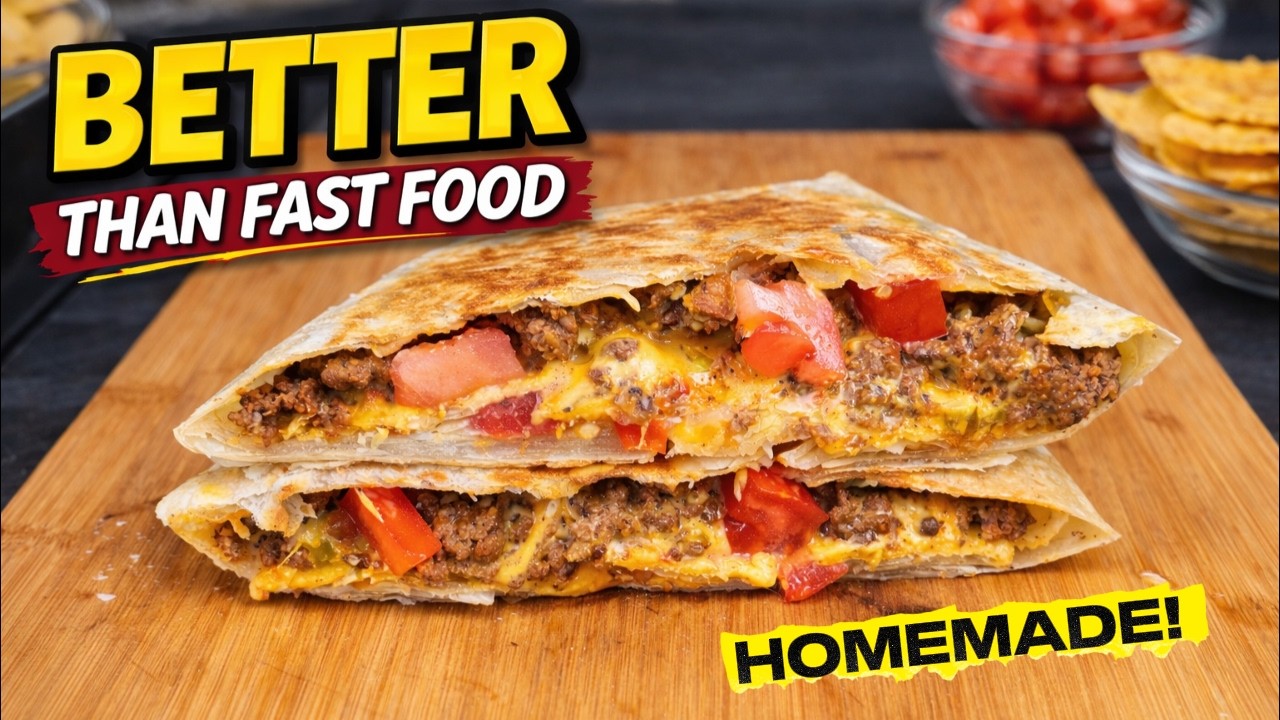 Today I made a Crunchwrap Supreme… but better—loaded with seasoned beef, nacho cheese sauce, and a crispy tostada layer wrapped in a toasted tortilla.