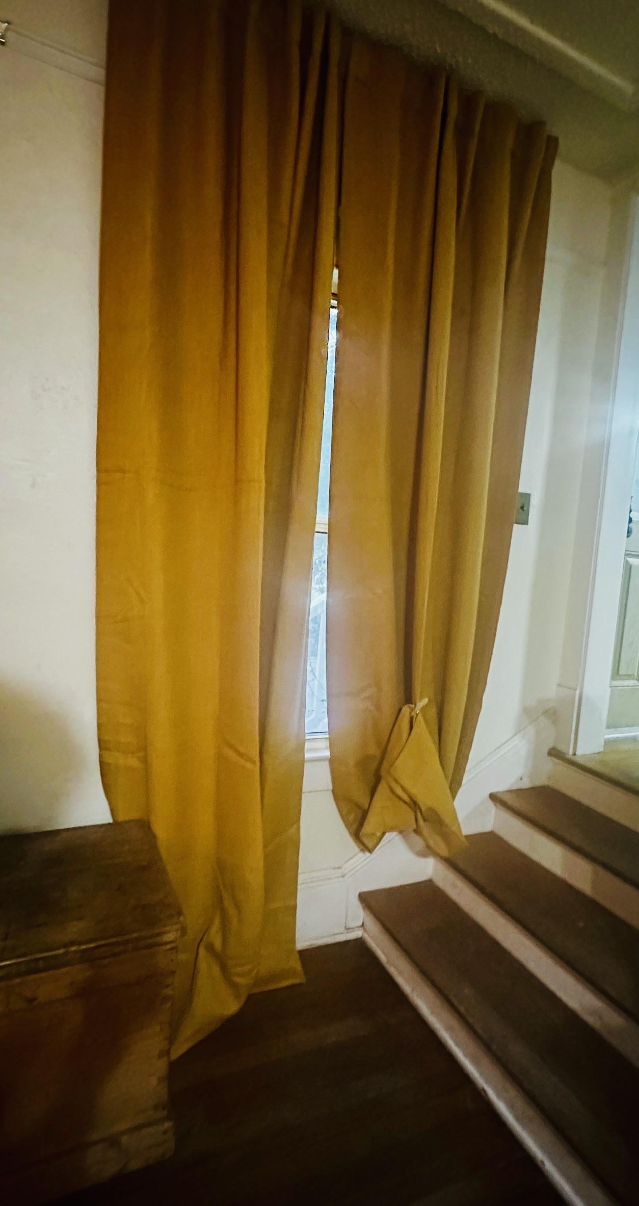 I have two windows side-by-side, but the steps are causing a problem with the hem at the right hand window. I’ve just pooled it on each step but it’s a dust and fur catcher. ( I want to hem the left-hand curtain)