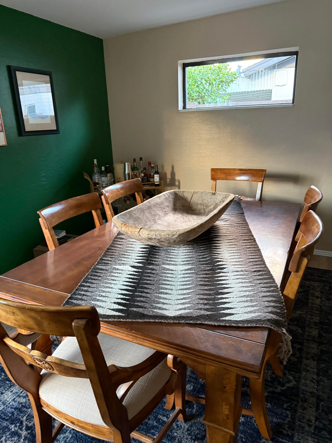 It seems too large for the table. Could it be used elsewhere and possible keep the runner and spruce up with candles? Maybe put it on the bar caddy and add bottles in it if the base is flat enough.