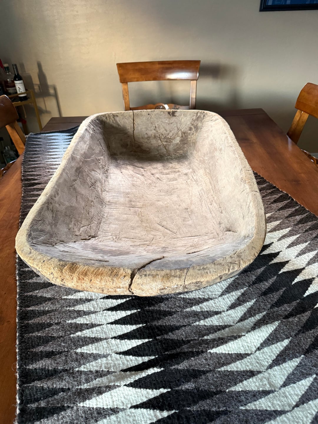 I think this is a dough bowl. Very old. You could use some salad bowl treatment to rehydrate it – bees wax based? That said I think one or 3 large conch shells or sea urchin shells would be interesting. I’ve also seen these displayed on walls but not sure how they hang them. A good antique store might be a resource if that seems like a good option.