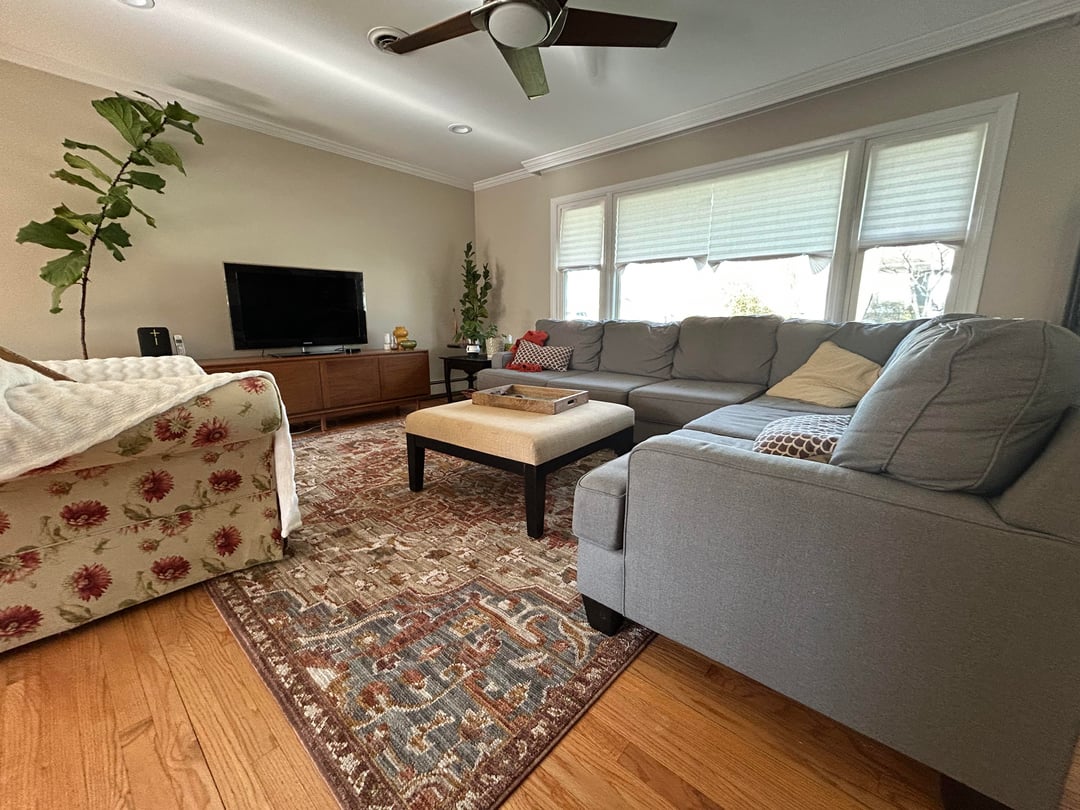 I’d skip black curtains since they’ll feel too heavy in this light room. A warm neutral like tan or soft taupe will look clean and match the rug nicely, or you could go with a muted/dusty green for a bit more style without overpowering the space. Try holding fabric samples next to the rug and sofa before choosing, and hang the curtains a bit higher and wider to make the room feel bigger. For the floral chair, a simple solid cover in a neutral or soft green will help it blend in better.