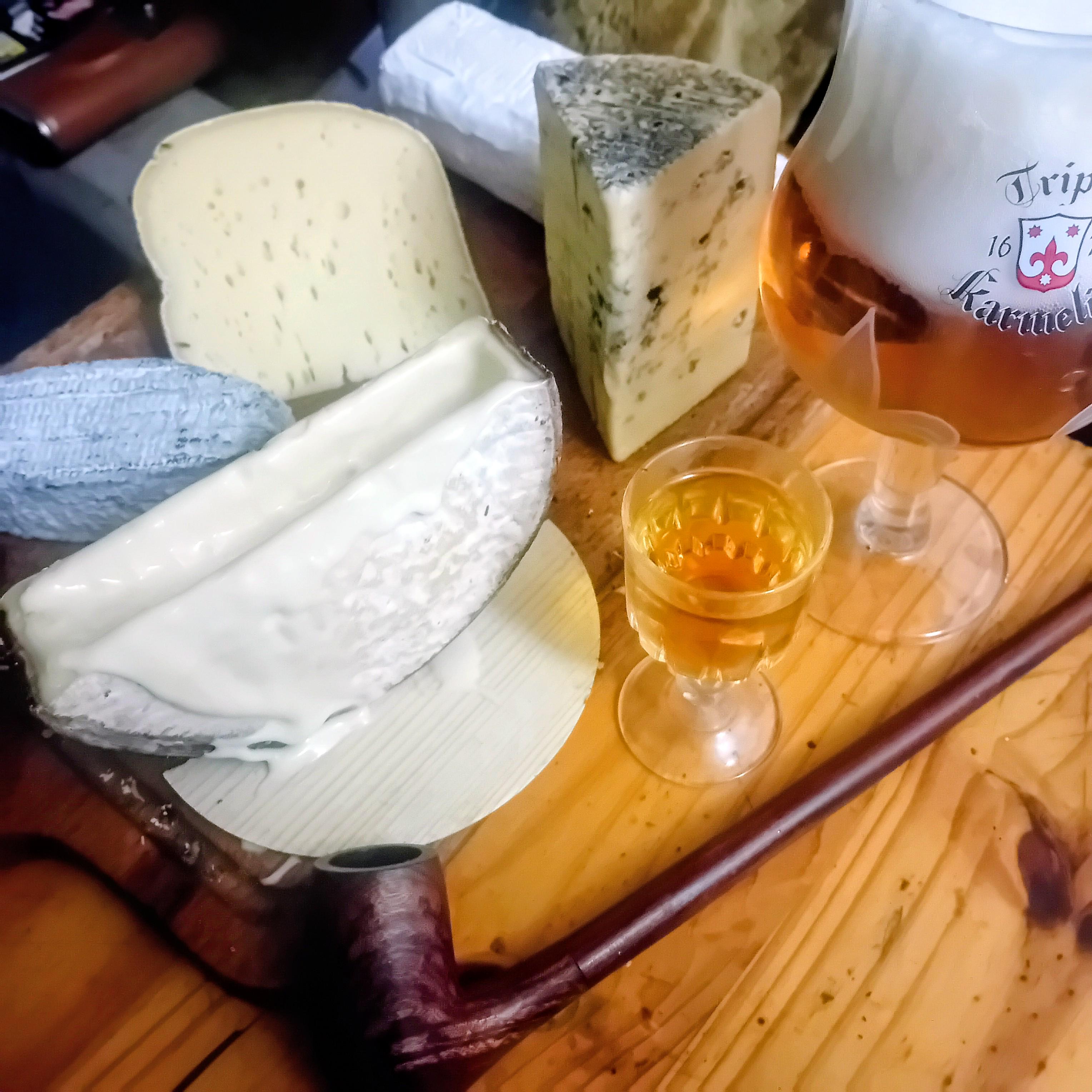 Buche de chèvre , Cashel Blue d'Irlande, tomme des Flandre affinée à la bière, Ovalie ( chèvre cendré d'Aquitaine ), un fromage très crémeux dont j'ai oublié le nom – on dirait du mont d'or en plus boisé