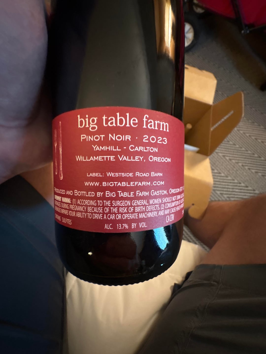 I picked this up at a wine tasting recently. The front label with Laverne and Shirley is usually used on the Willamette Valley Pinot, but the back label says it’s the Yamhill Carlton , and a totally different label design. I texted Big Table Farm a couple days ago but haven’t heard back. Any guesses to what I actually bought?
