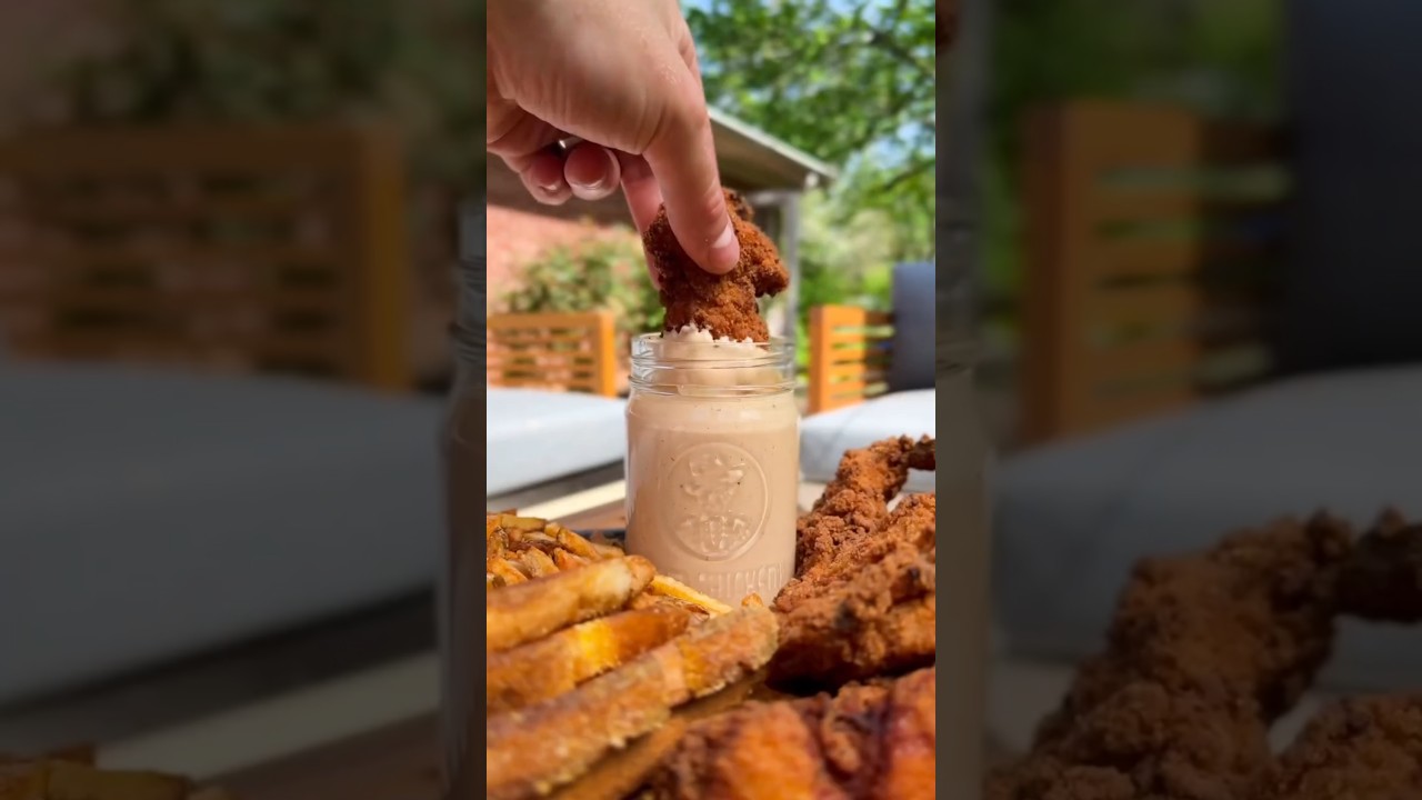 •INGREDIENTS:1/2 cup mayo2 tbsp ketchup1 tbsp BBQ sauce1 tsp Dijon mustard1 1/2 tsp Worcestershire sauce1/2 tsp garlic powder1/2 tsp onion powder1/4 tsp smoked paprikaA few dashes of hot sauce to tasteSalt & black pepper, to tasteOptional: pinch of cayenne for extra heat•FRIES: soak them in ice water to draw out starch. Fry at 350F for about 10 minutes, remove for 5 to cool down a little, then back in for 5 minutes to get crispy.•CHICKEN TENDERS: mix in a batter of 2 cups buttermilk and 2 eggs, then a dry mix of 2 cups bread crumbs, 1 cup flour, and 1/4 cowboy butter seasoning. Fry at 350F until golden brown