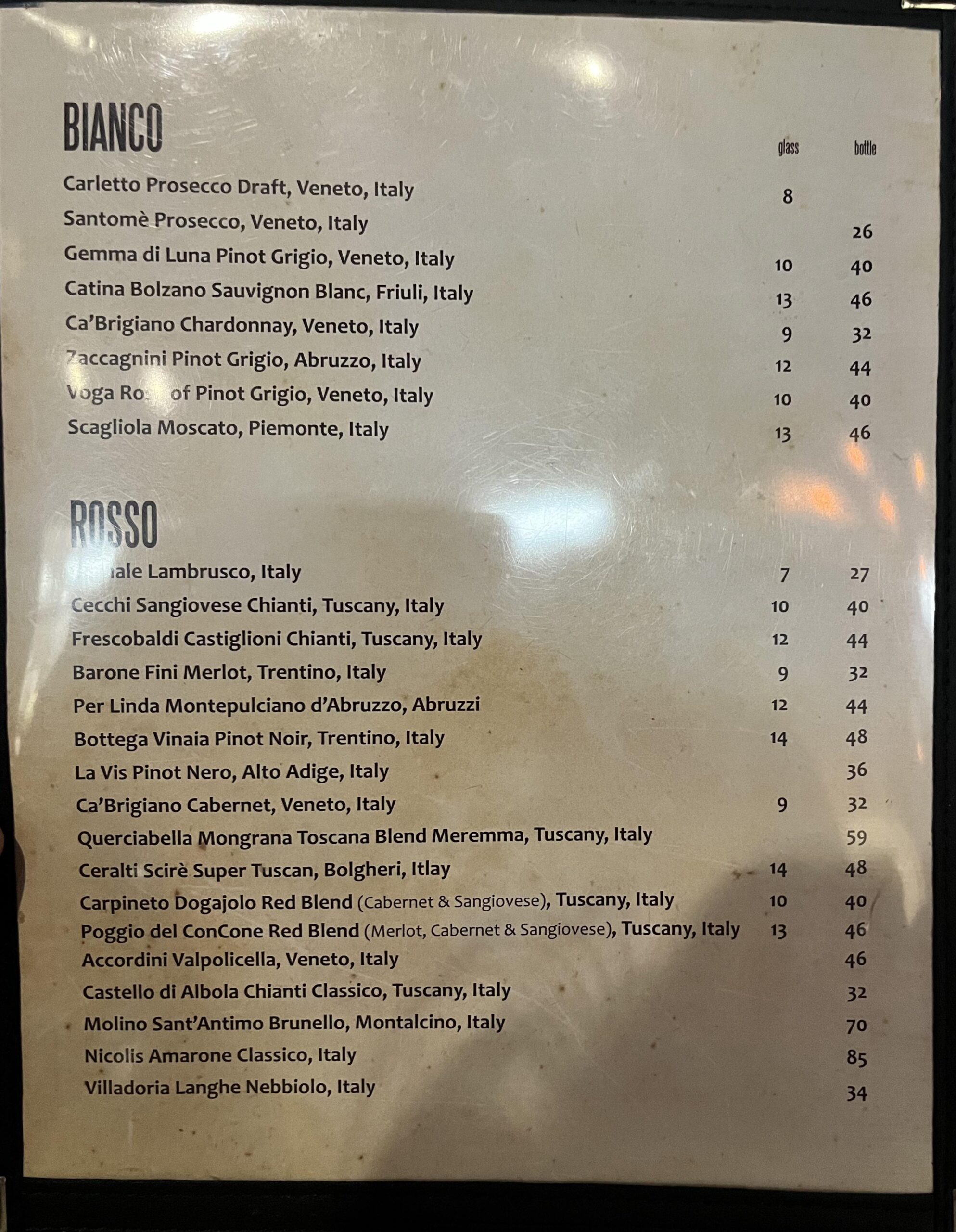 The Frescobaldi is good, Querciabella is solid and the glera on draft is $8.00.