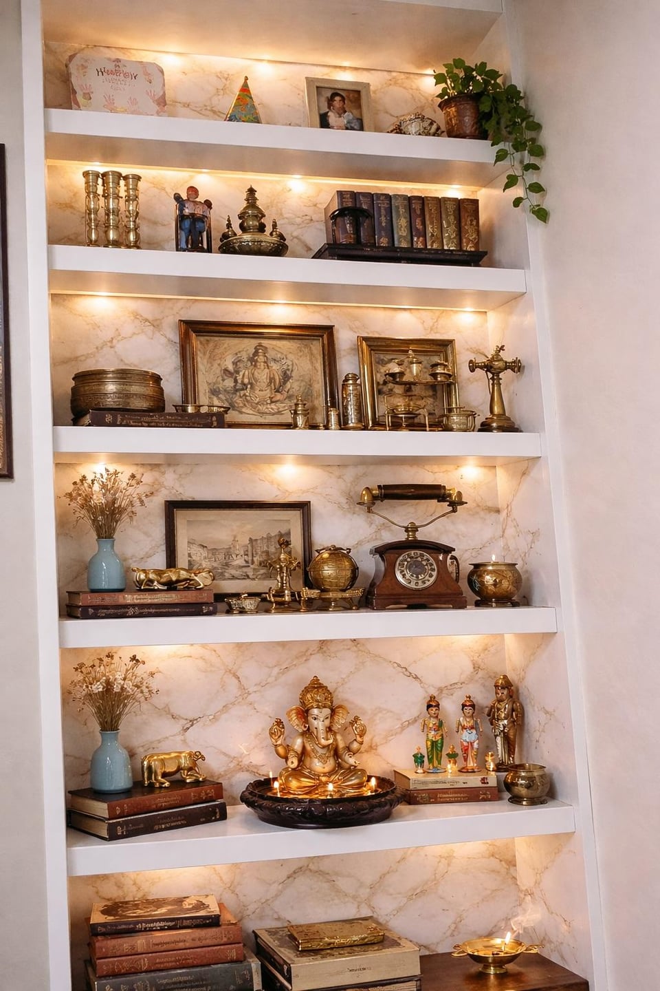 I’m trying to get a warm, under-shelf lighting look like the second photo, but my setup is the first one. I only have one outlet at the bottom.