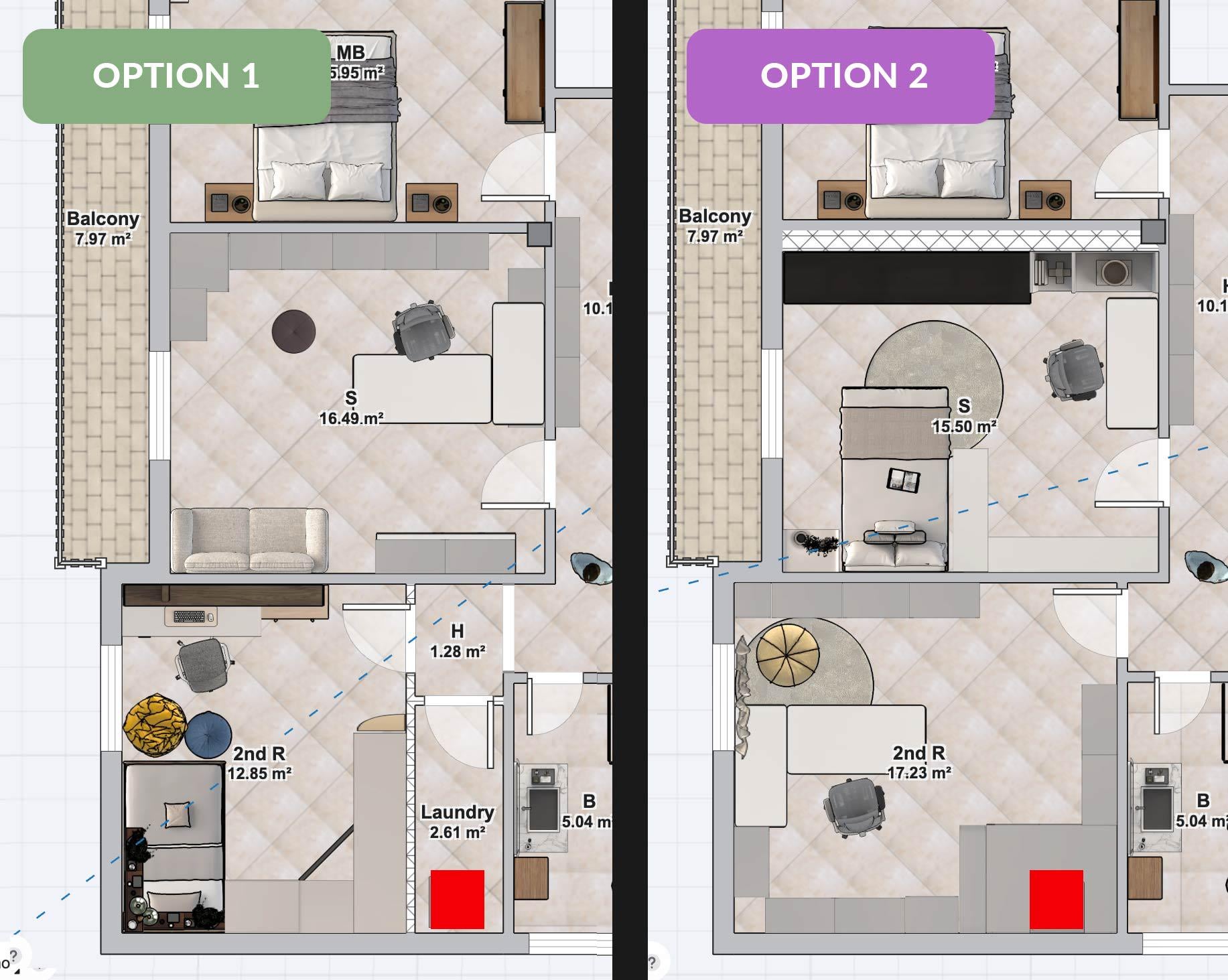 Option 1 feels right. The privacy issue alone would push me there – a teen sharing a wall with your bedroom is uncomfortable for everyone, and that doesn’t really improve with room size. Kids don’t actually need huge rooms; they’ll sprawl into whatever space you allow. A well-designed smaller room plus the study as overflow is totally workable. The laundry nook idea is clever too.