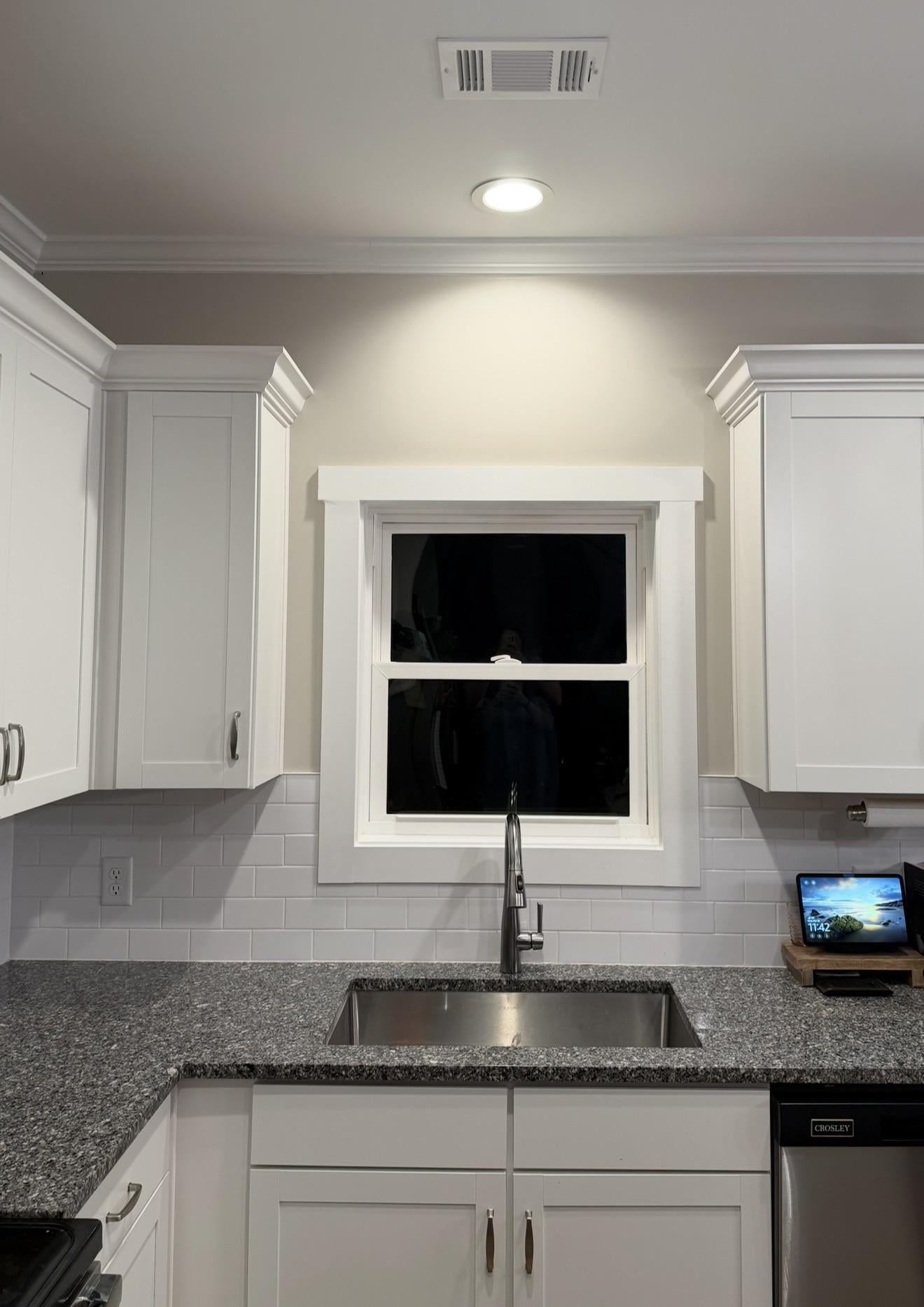 Add more items on the countertops like wooden cutting boards leaned up against the wall, cookbooks, a cozy corner lamp or candle with some color. And painting the wall! Perhaps some under the counter strip lights in a warm color.