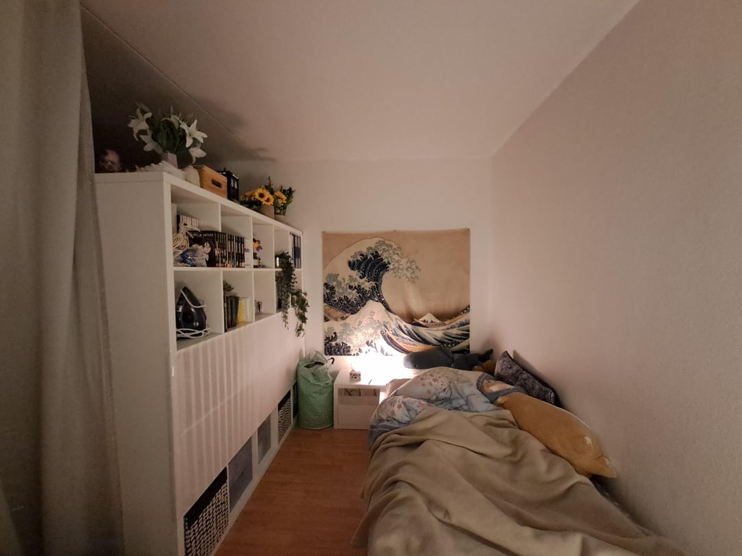 about the room: its split in two by a kallax and beige curtains.