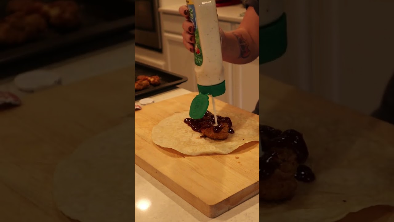 Bake or airfry your chicken according to package directions. Warm your wraps. Place cooked chicken in the wrap and top with your favorite toppings. We used shredded cheese, lettuce, tomato, BBQ sauce, ranch dressing, and French-fried onions. Roll, slice, and serve! Dinner is on the table in no time!
