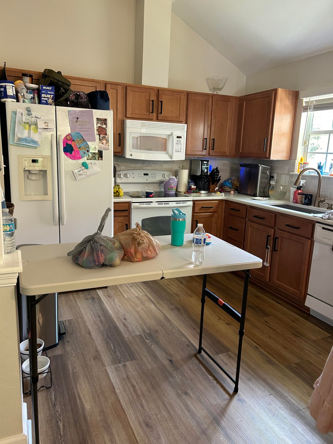 Swipe to see the pic I asked AI to make. I asked for a shorter table but ChatGPT couldn’t get it right. We want it to be open under the island, due to the small space we thought open would visually be better and we want to get quartz to match our counters (we added these counters last summer). So that’s what AI made for us.