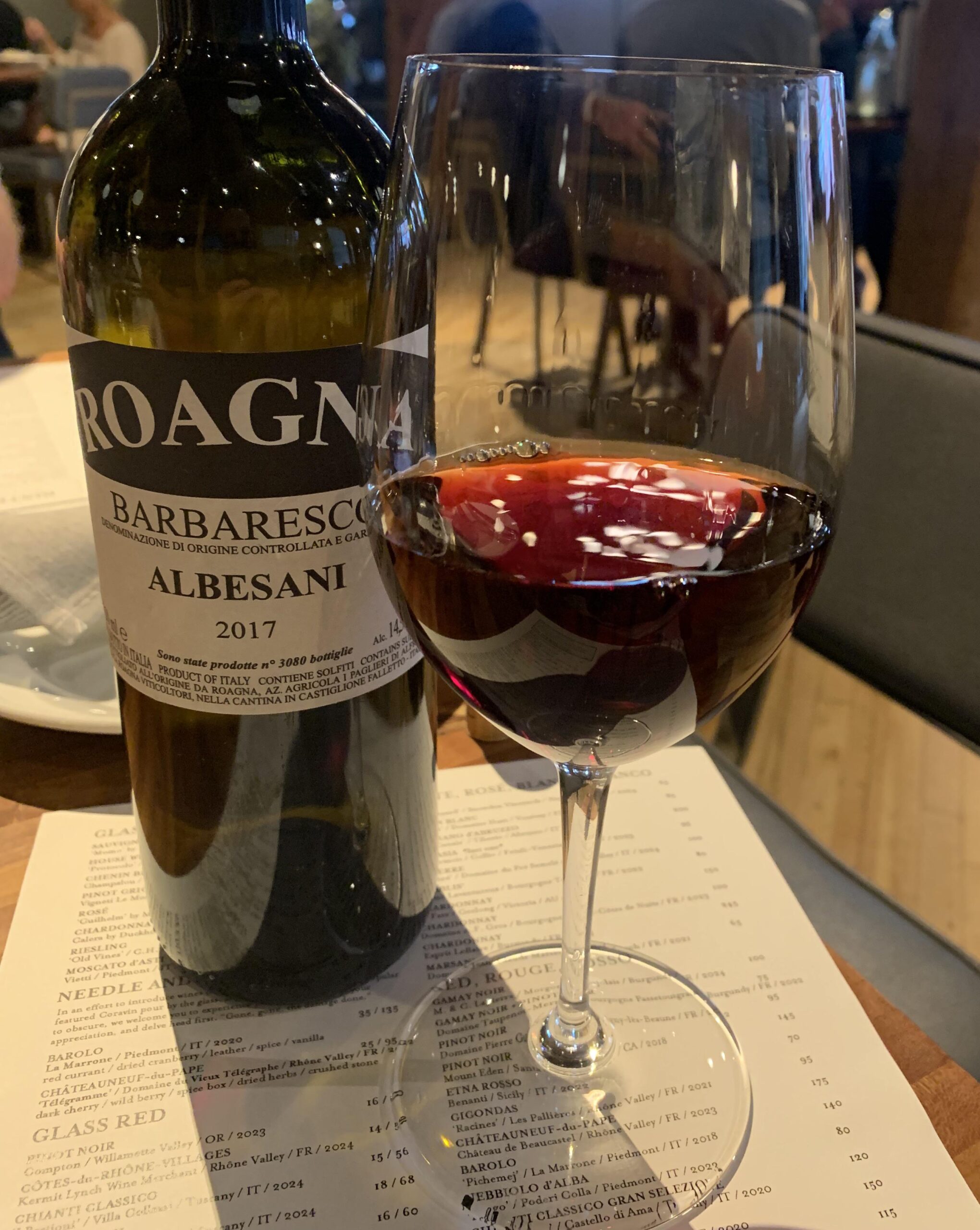 Popped and poured, ready to go out of the gate. Simply gorgeous stuff. Dried tart cherry, roses dried and fresh, tarry earth. Elegant, ultra fine tannins and acid core give requisite structure; played well with pork tenderloin and a wild berry sauce. $215 in restaurant