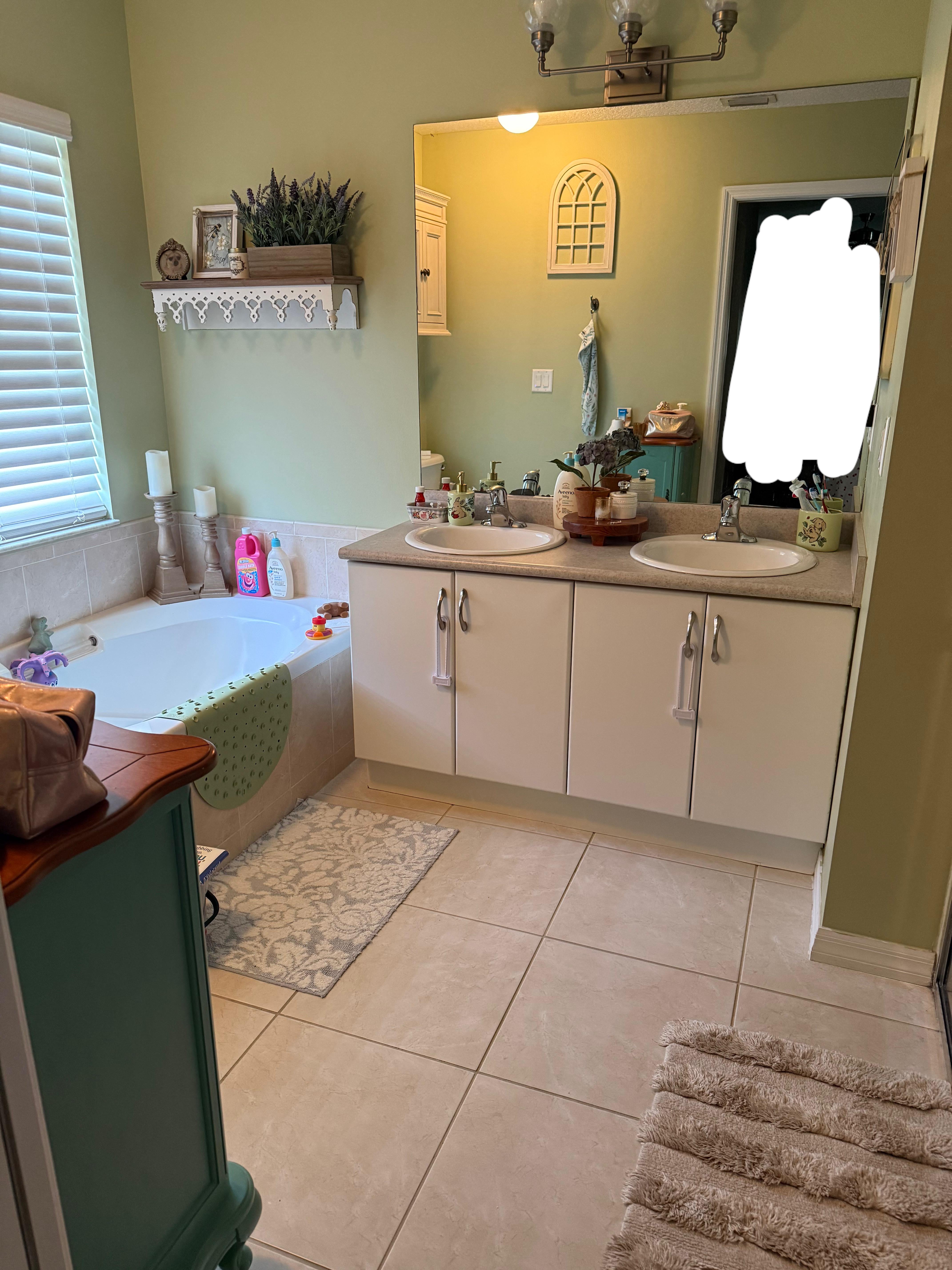 What would you do to this bathroom if it were yours? We have lived here for 6 years and I did a mini makeover when we moved in but we still aren’t at the place for a remodel or anything like that. What cosmetic changes would you recommend? I would love blue walls but the countertops and shower tile is sort of pinky so it’s hard to match up. Also, I need to paint the baseboards but have never gotten around to it. Any suggestions are welcome!