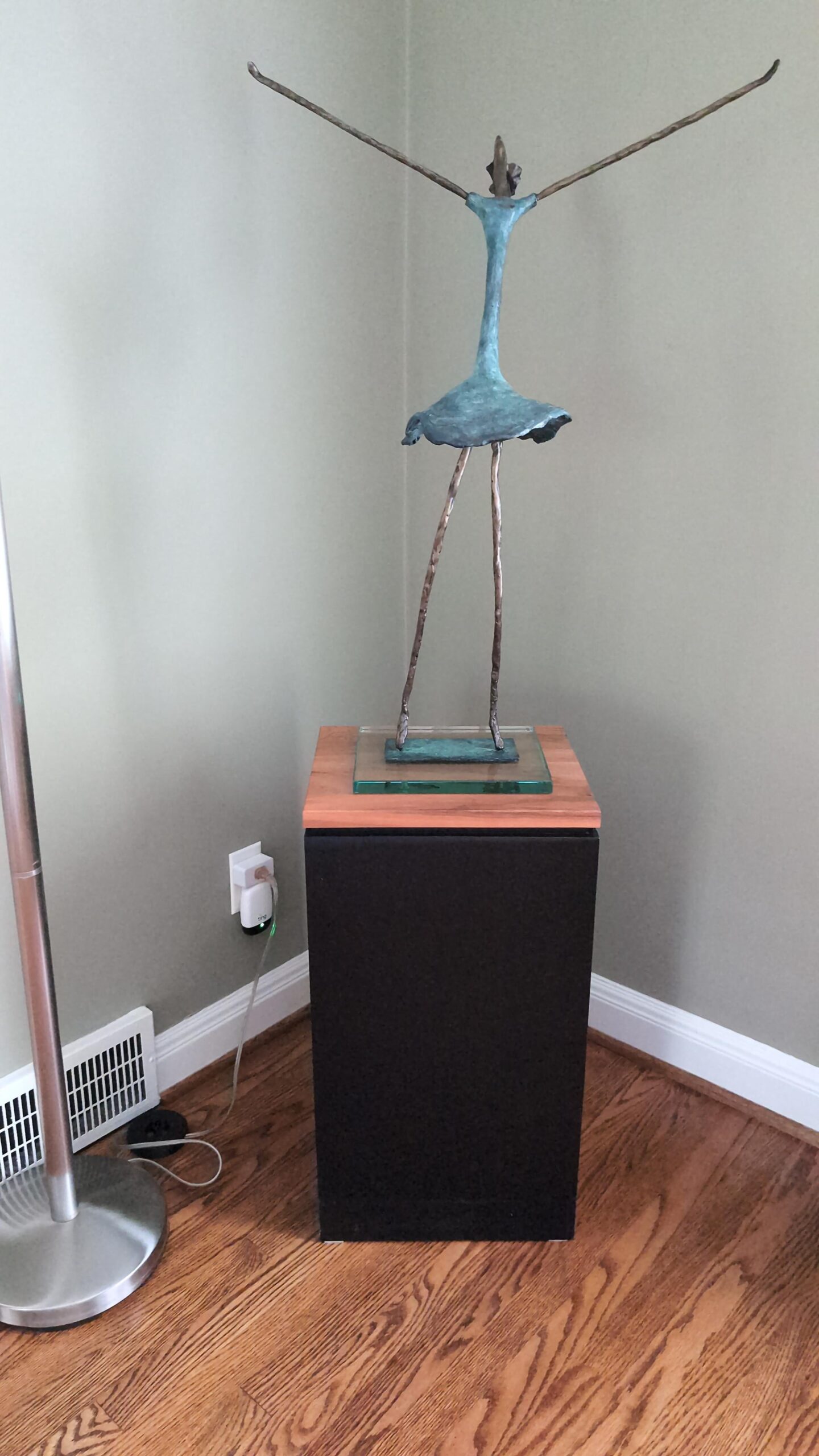 I'm looking for an elegant way to light (up light? Down light?) this sculpture, which I adore. The room is a challenge, as there are zero overhead lights and zero wall switches. I was thinking about a puck-style uplight, but there isn't a subtle way to run a cord.