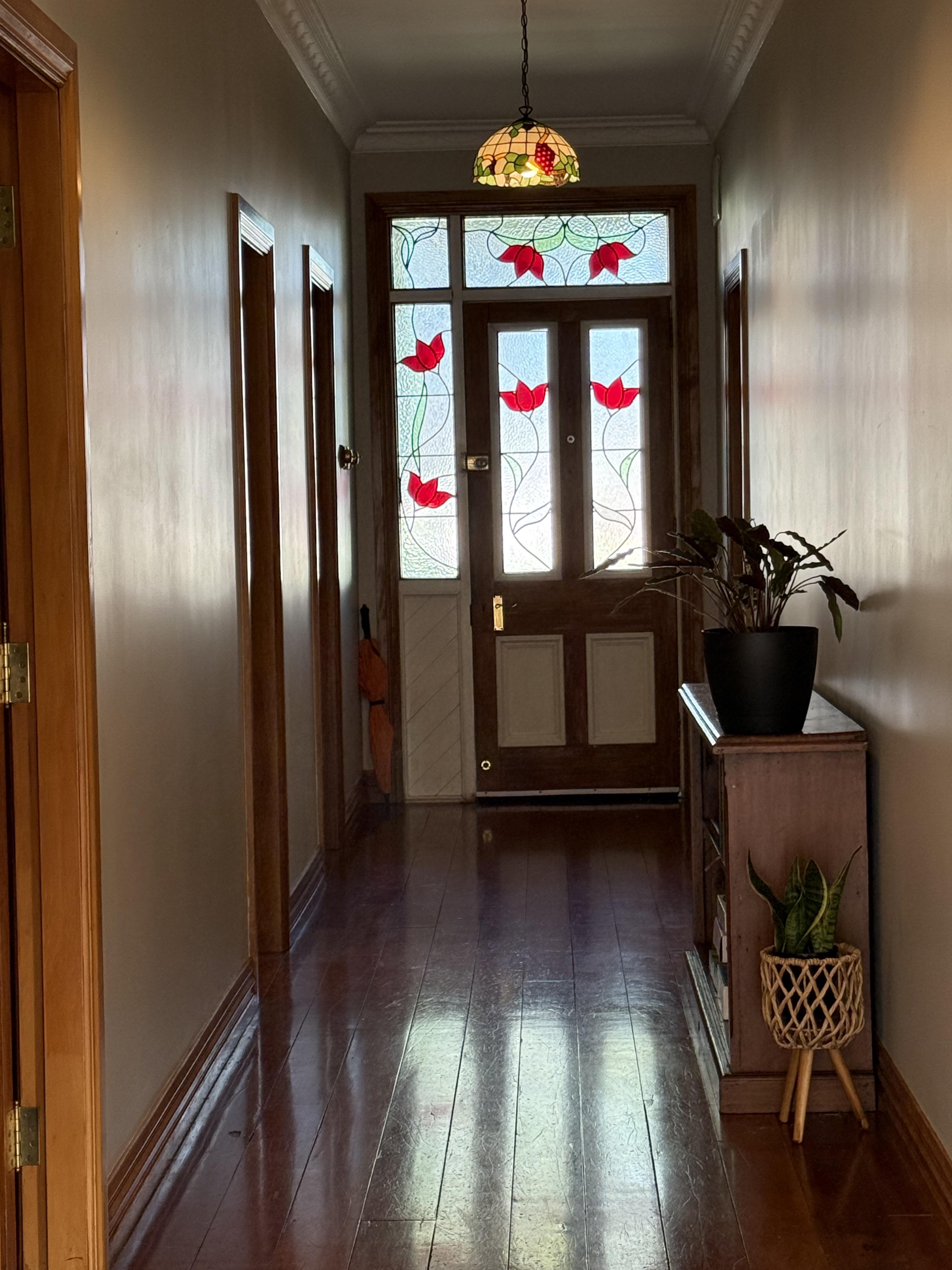 Do you need that bookcase here and do you love those stained glass light fixtures? If not, I’d get a huge piece of art for that wall and light it with picture a nice picture light. Then find more overhead fixtures that look better in succession with each other.