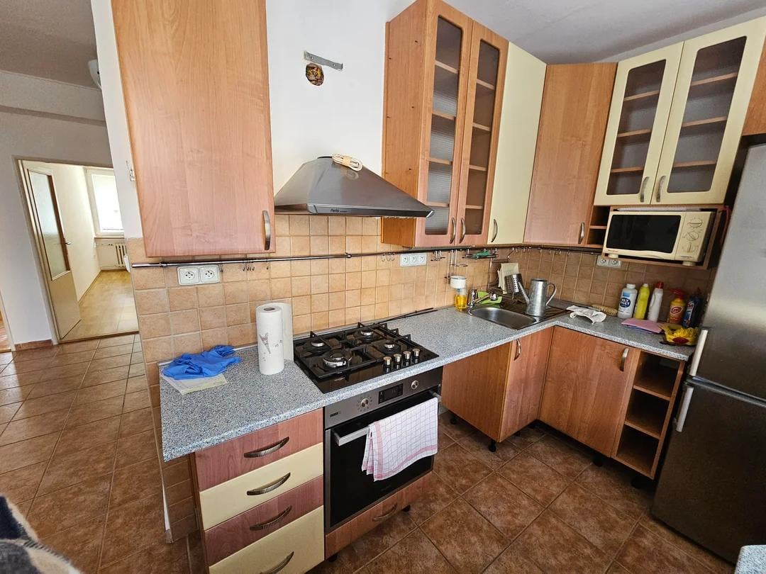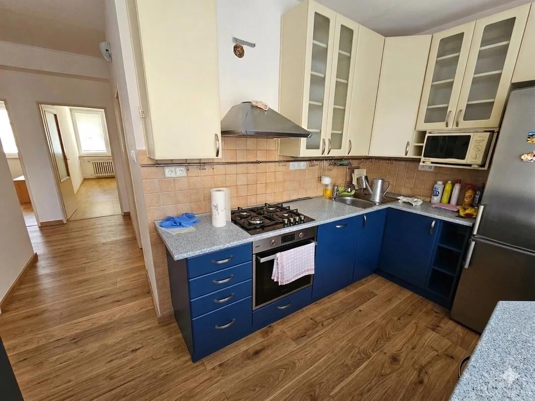 Looking for ways to repaint this kitchen in a way, where it doesn't look awful in a few years down the line. Don't wanna spend the money changing the countertop – so we're stuck with a light blue/terazzo one.