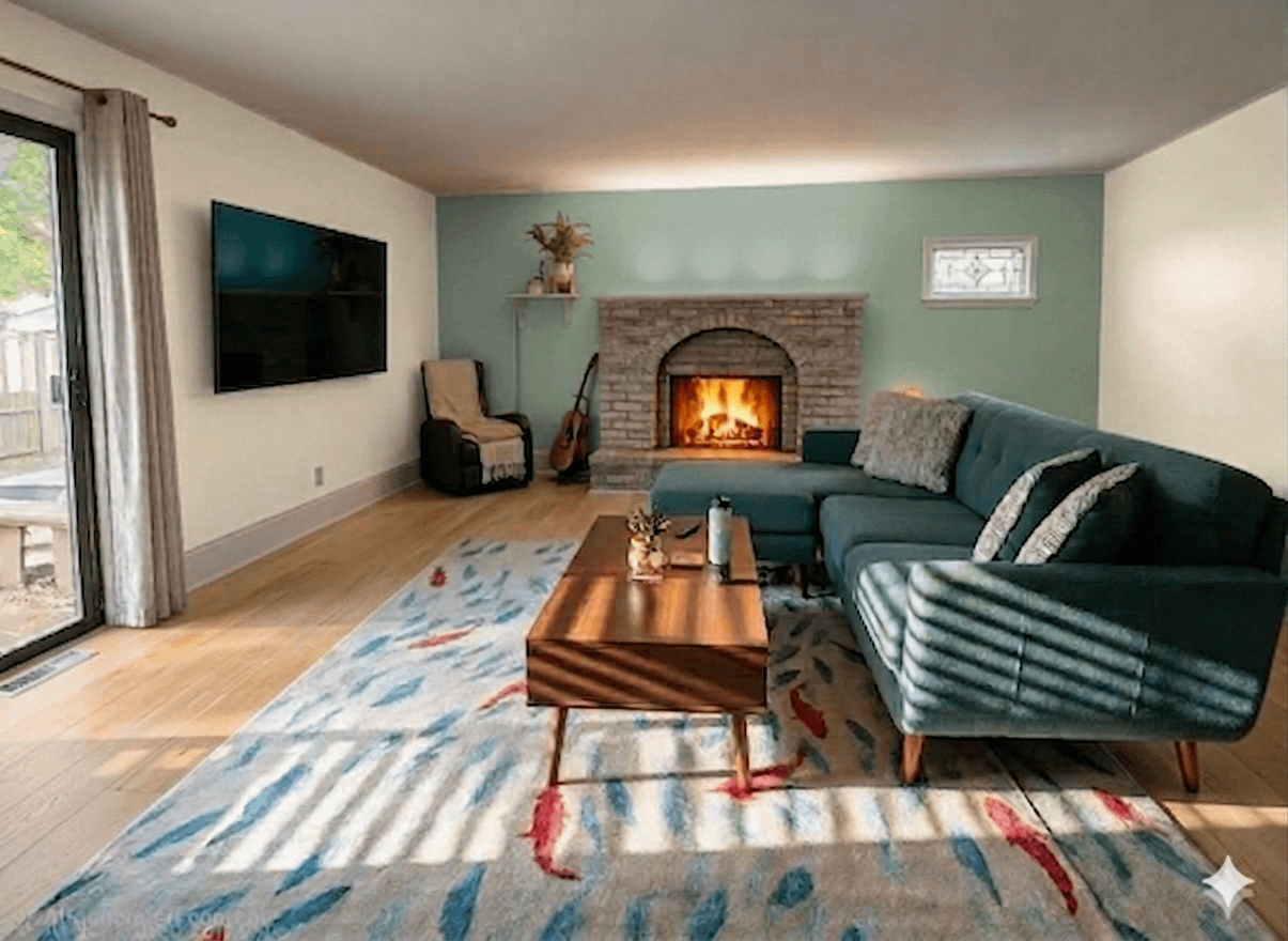 Can you please post some more pictures without post production with gemini? The problem I see is that the accent wall and the layout focus on different things. the sofa is not facing the Tv, the chair looks lonely in the corner. Maybe a better layout will help you create a better accent wall