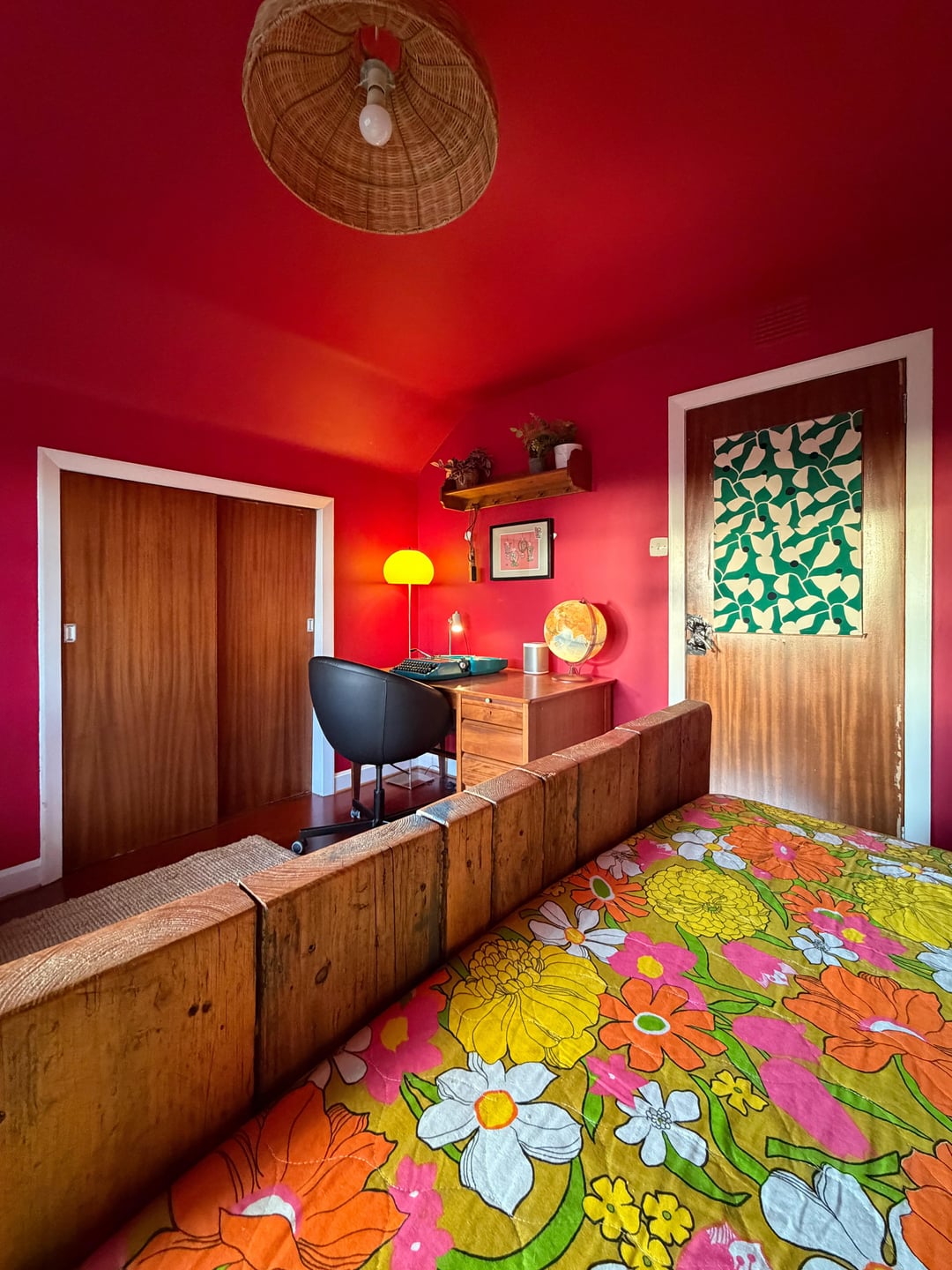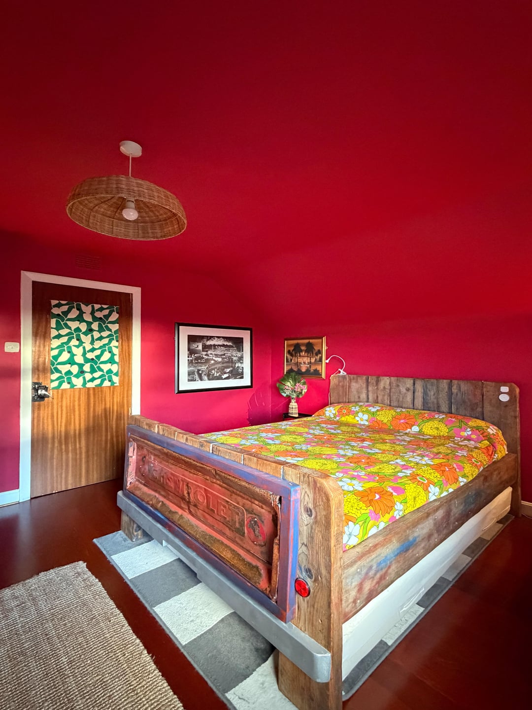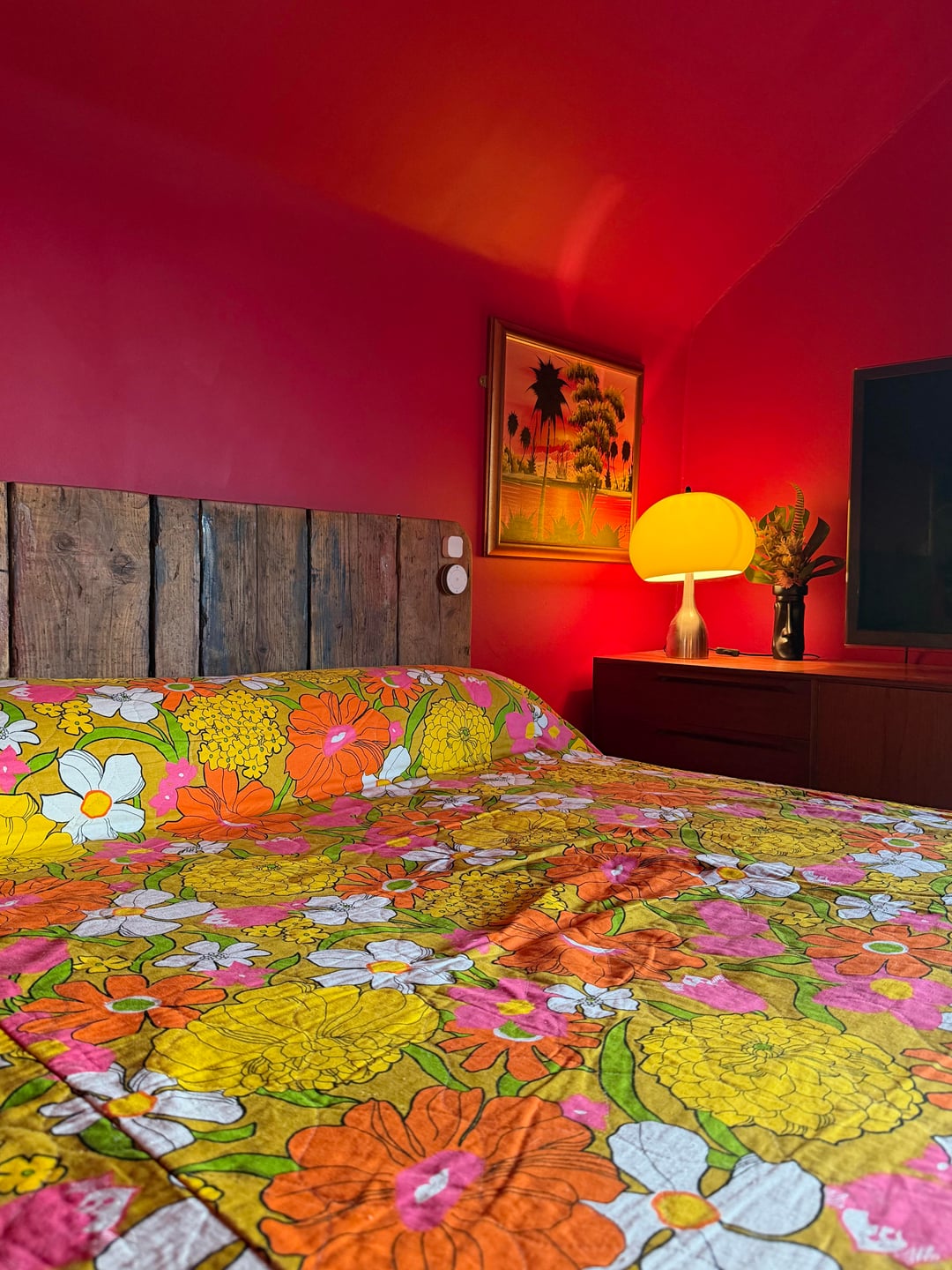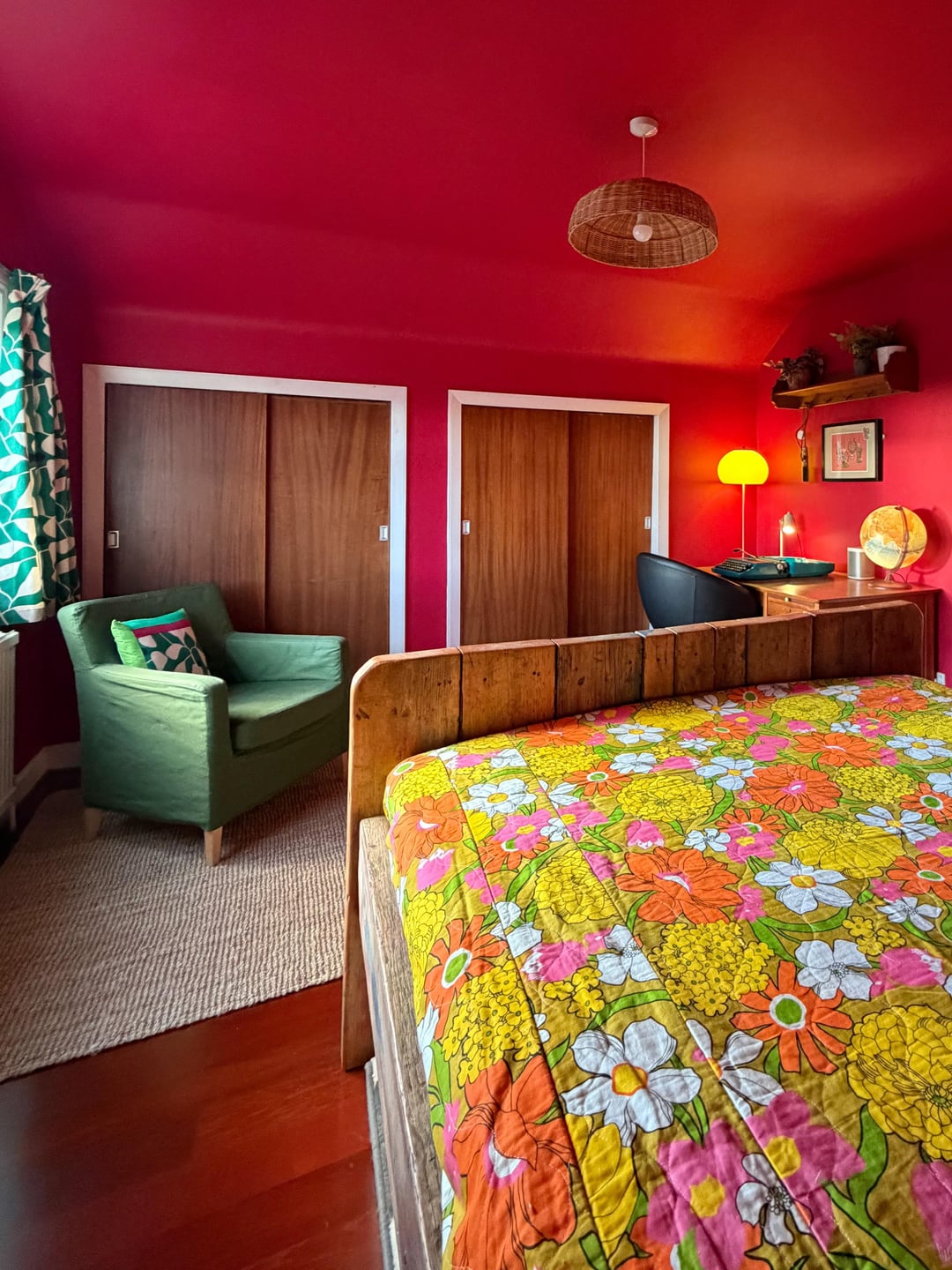 This is AWESOME! I love the vibes here. The wall color is so fun. The walls are intense, but as a guest the room is so unique and that’s why I like it.