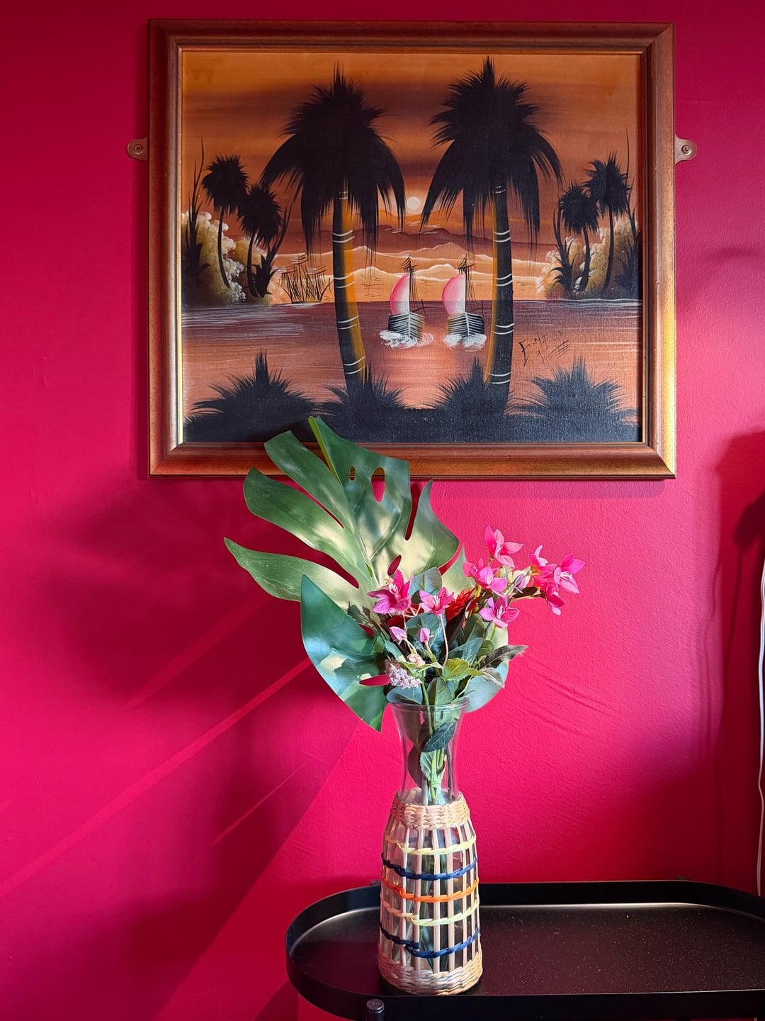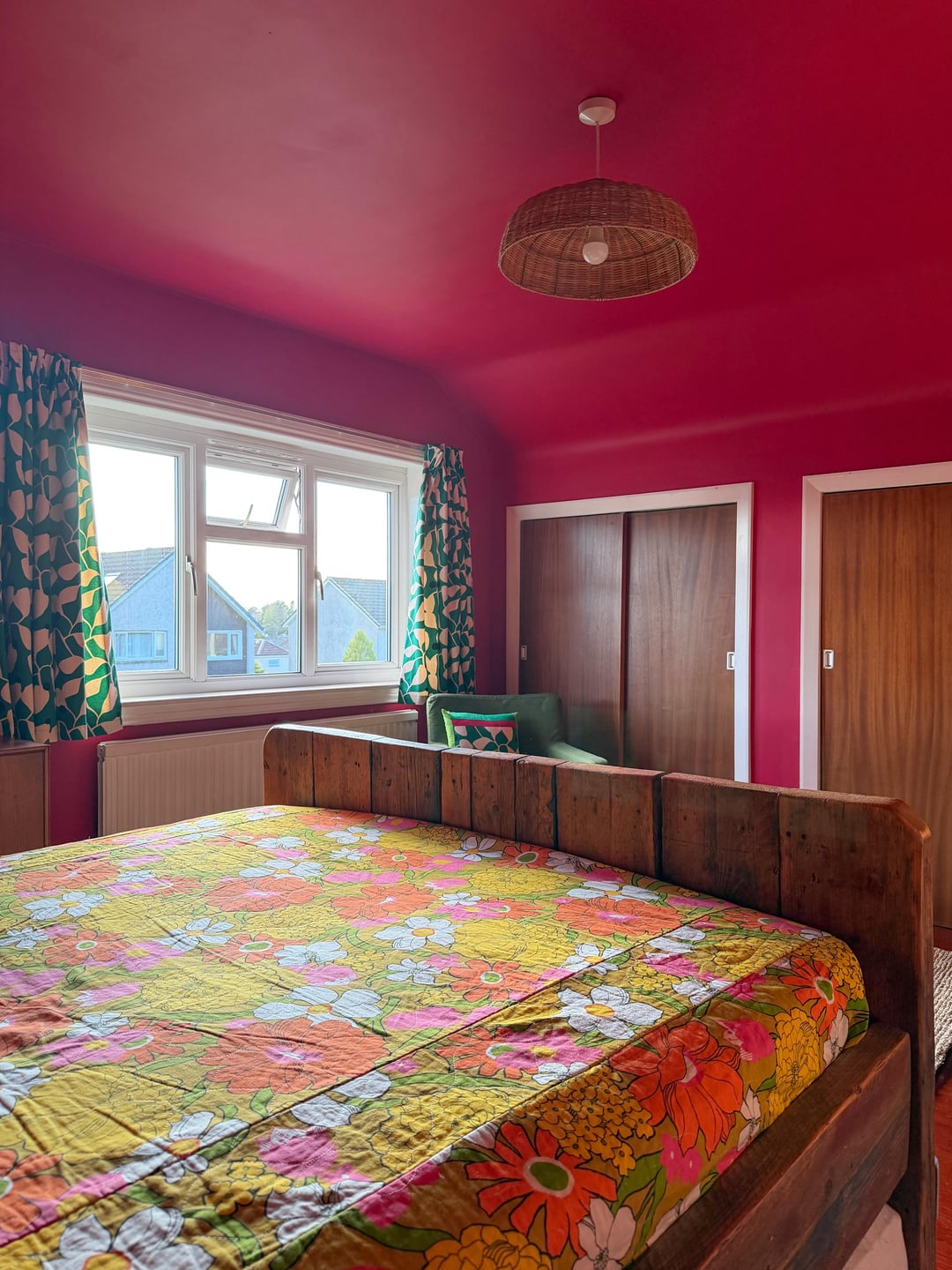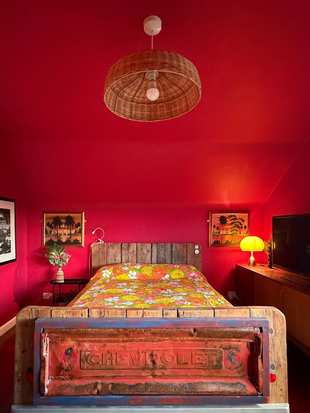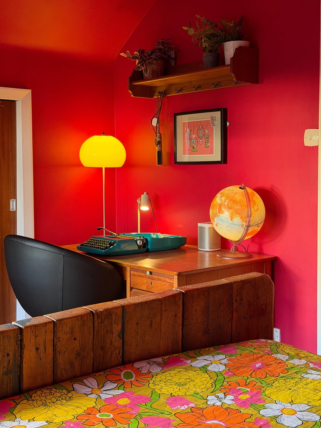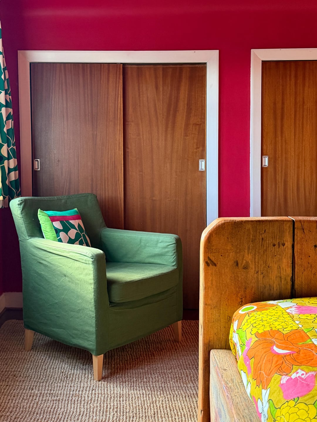 This is AWESOME! I love the vibes here. The wall color is so fun. The walls are intense, but as a guest the room is so unique and that’s why I like it.