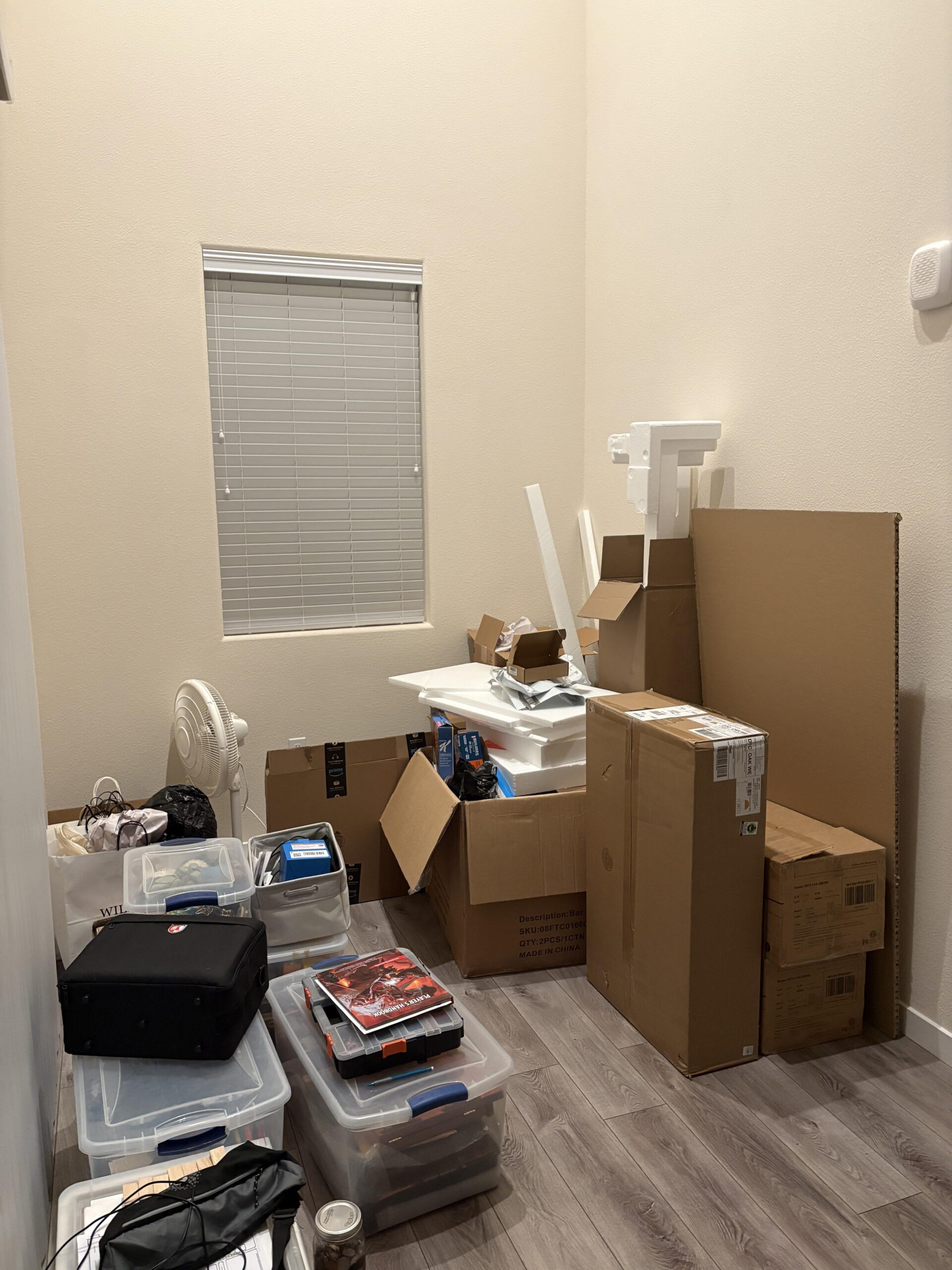 Just moved in 2 weeks ago. I need to break down all those boxes and toss them, but this is where I figured I'd have my desk. Recently thought about maybe getting an L shaped desk, possible this one (https://www.homedepot.com/p/Bestier-55-7-in-Rustic-Brown-2-Drawer-L-Shaped-Computer-Desk-with-Lift-Top-H100914E-RST/325905991)