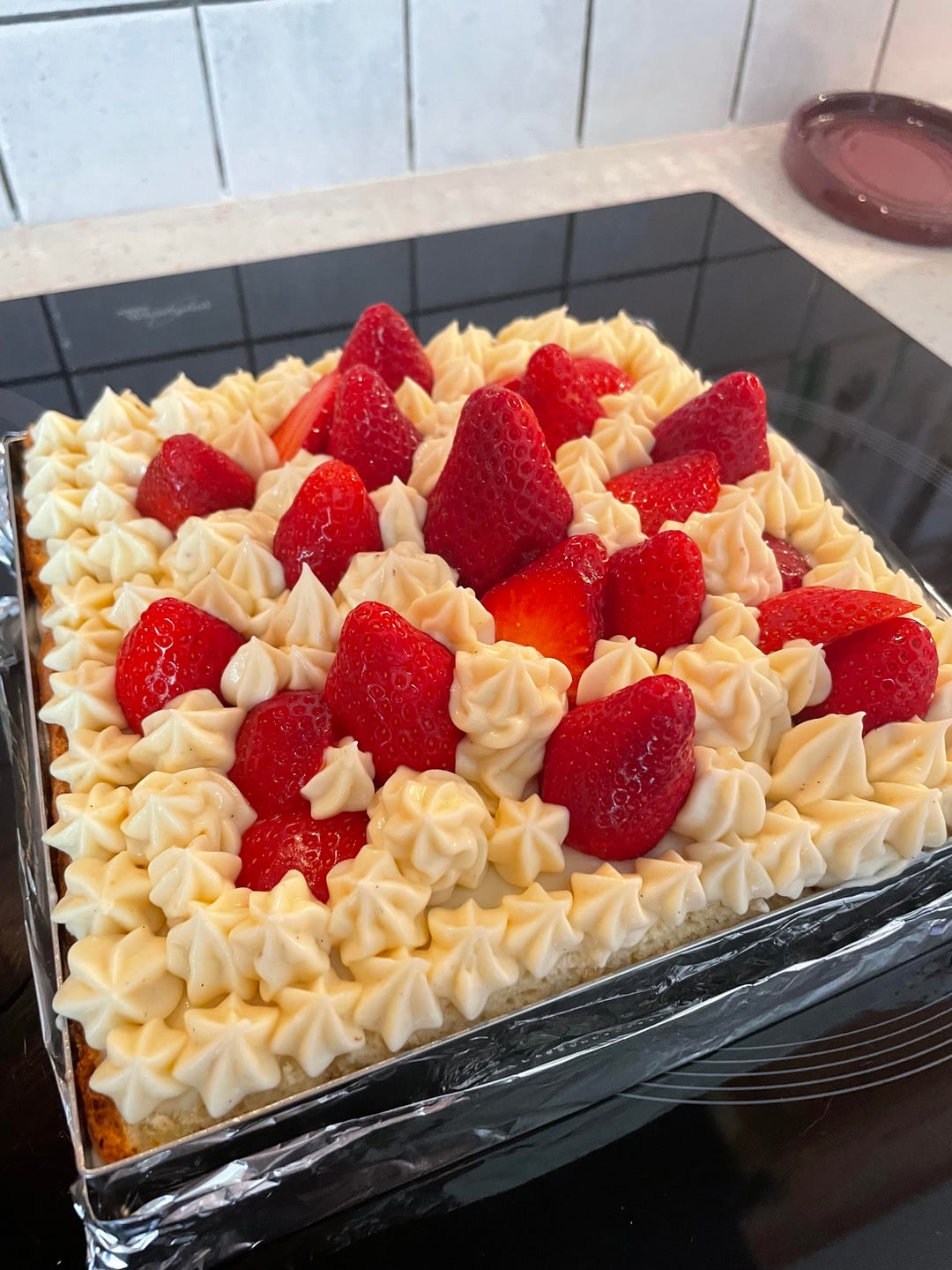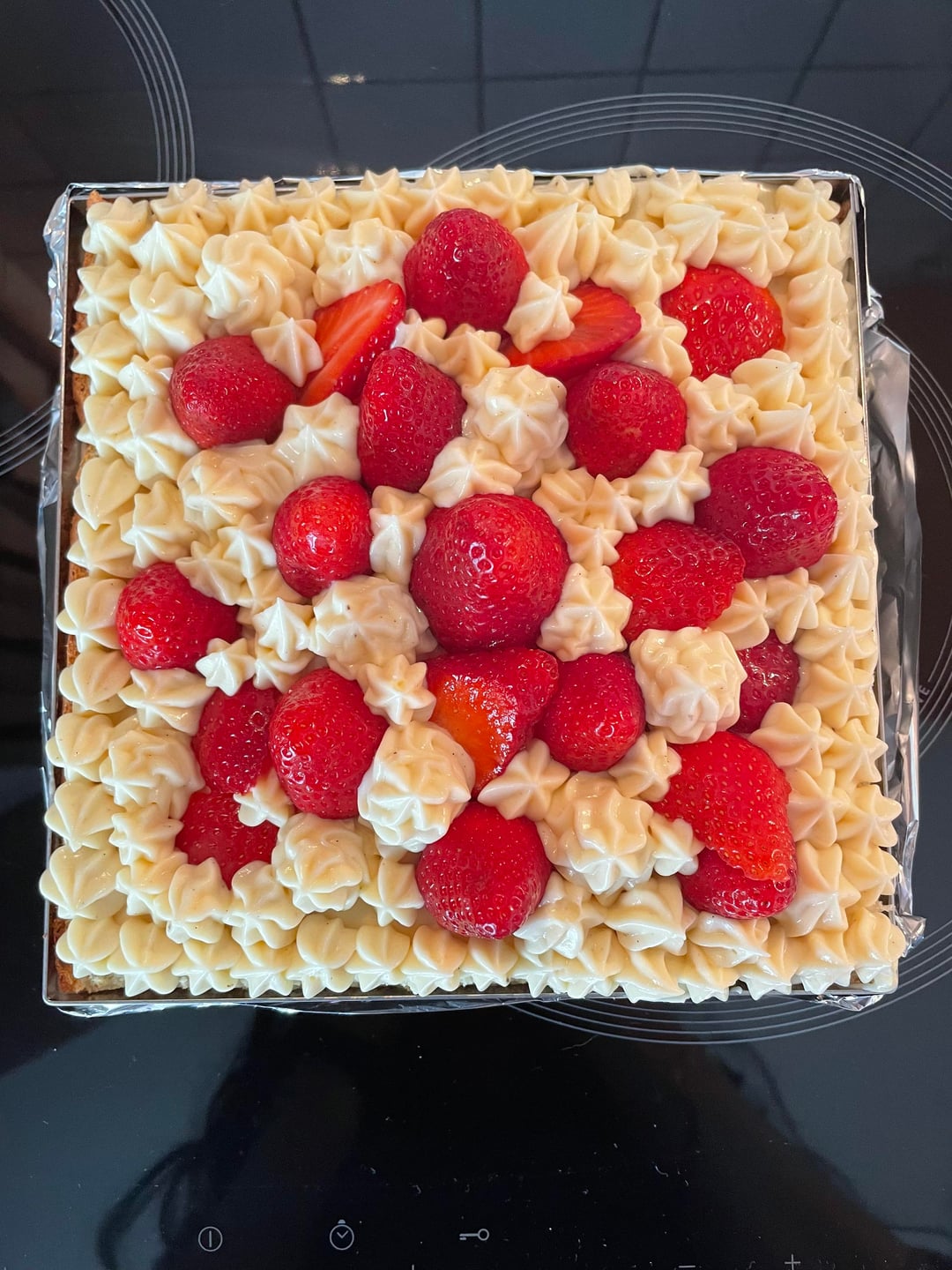 Pour la recette de creme patissiere, j'ai doublé les quantités de la recette en photo, et j'ai utilisé une barquette de 500g de fraises pour le montage !