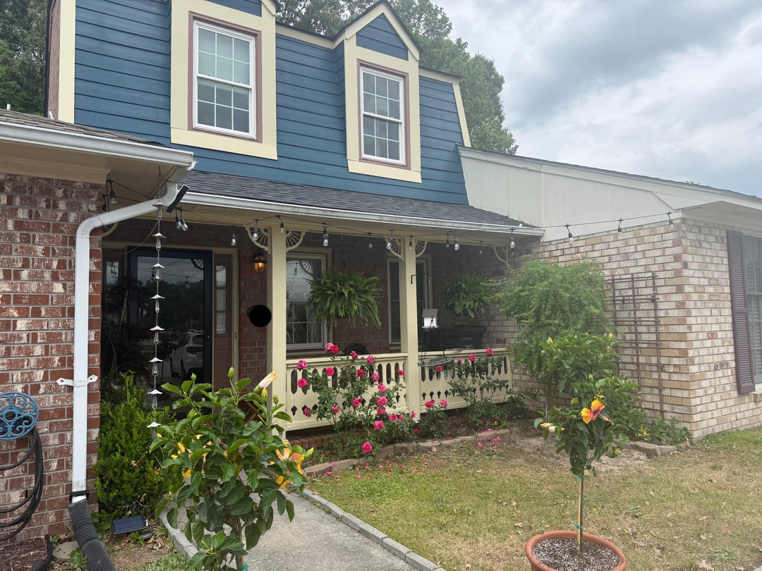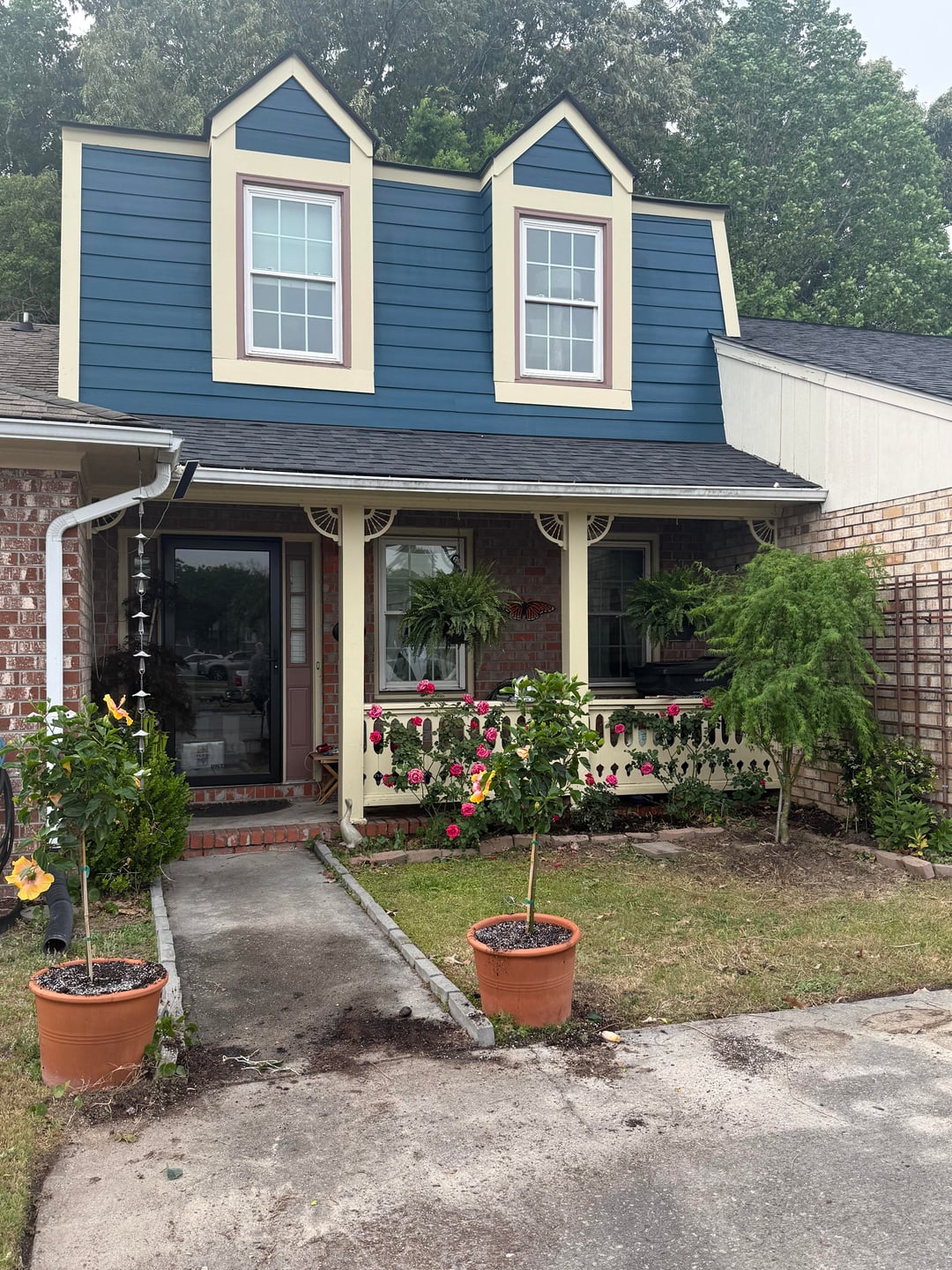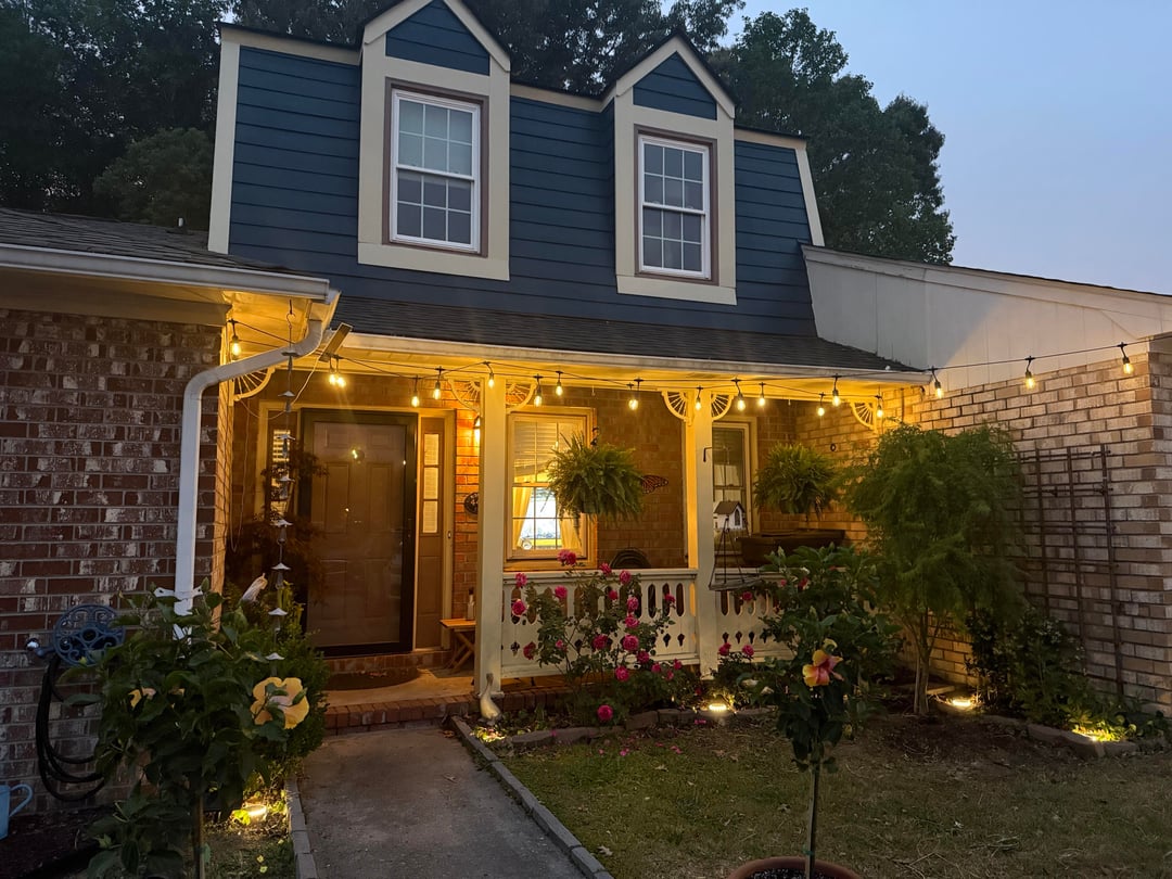 This was phase two of the beautification of my postage stamp yard. Phase one was replacing the roof, residing with hardy plank, installing a glass security door, and painting. Phase two were plants and lighting. Phase three will be window boxes with flowers.