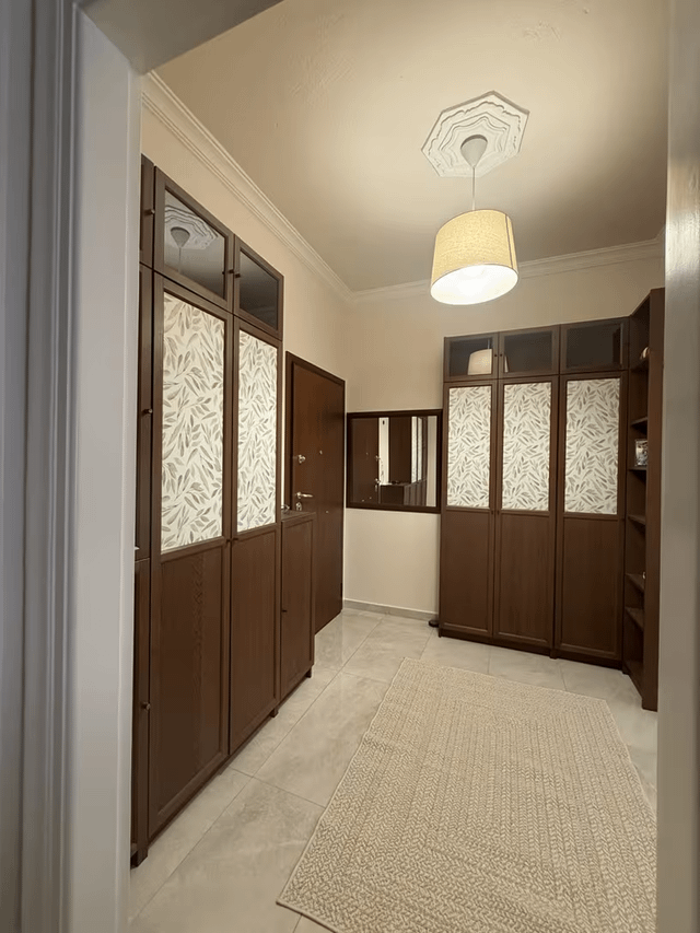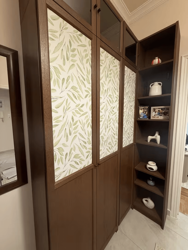 This entryway has a very solid and warm aesthetic – I really like the combination of dark wood and soft, botanical-themed wallpaper. But I feel like something is still missing to give it that final, cohesive touch that would make it truly complete.