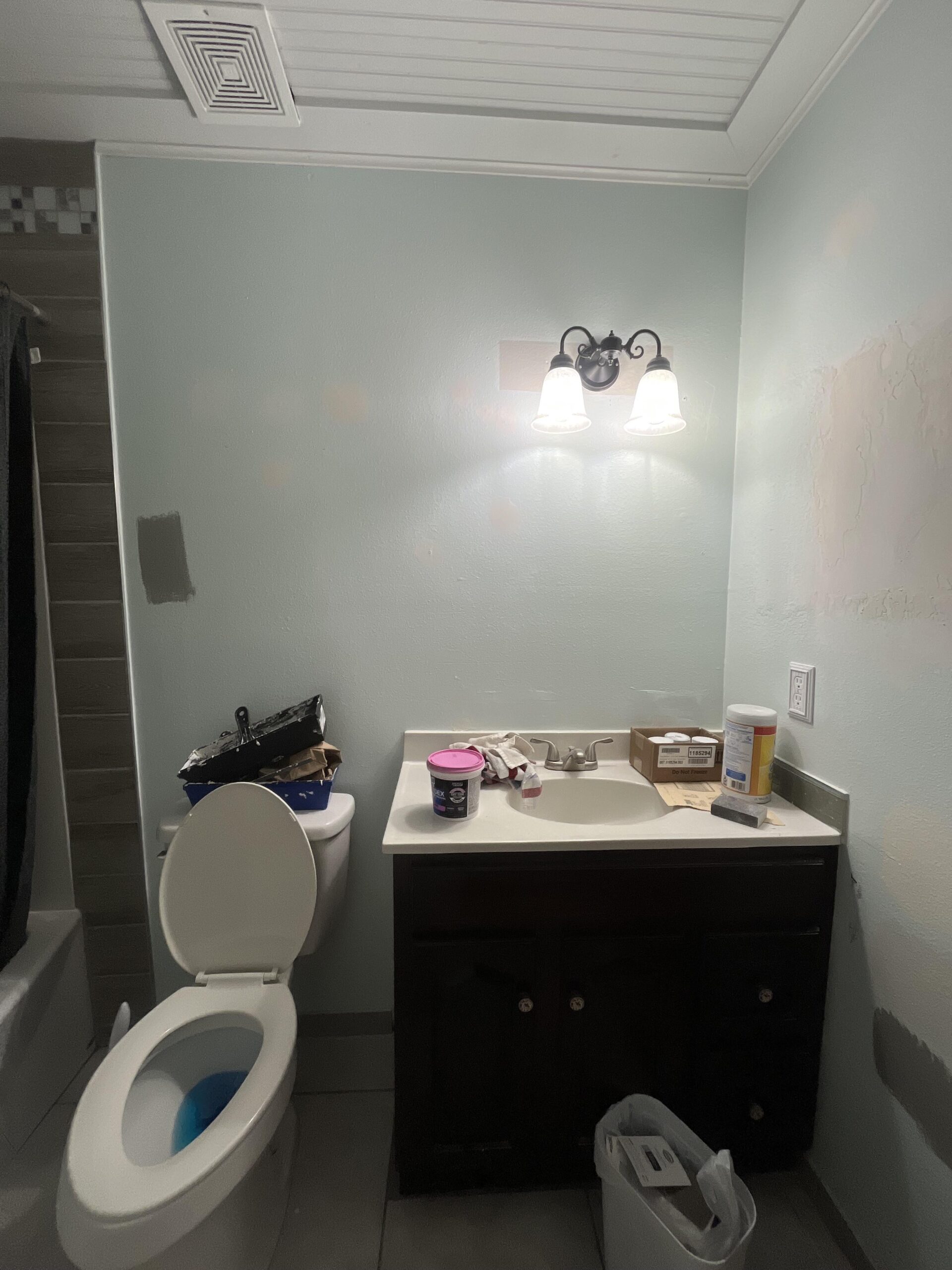 Hello! Really struggling with the decision of the paint color. we're going for cowboy/Western. The vanity was a brunt 90s orange and I stained it to an espresso. Trying to decide between white, greyish beish, light gray. Tried chat gpt but still stuck! Any ideas? It's obviously a small bathroom so I'm leaning light. Tiling on shower is cool toned gray and blue.