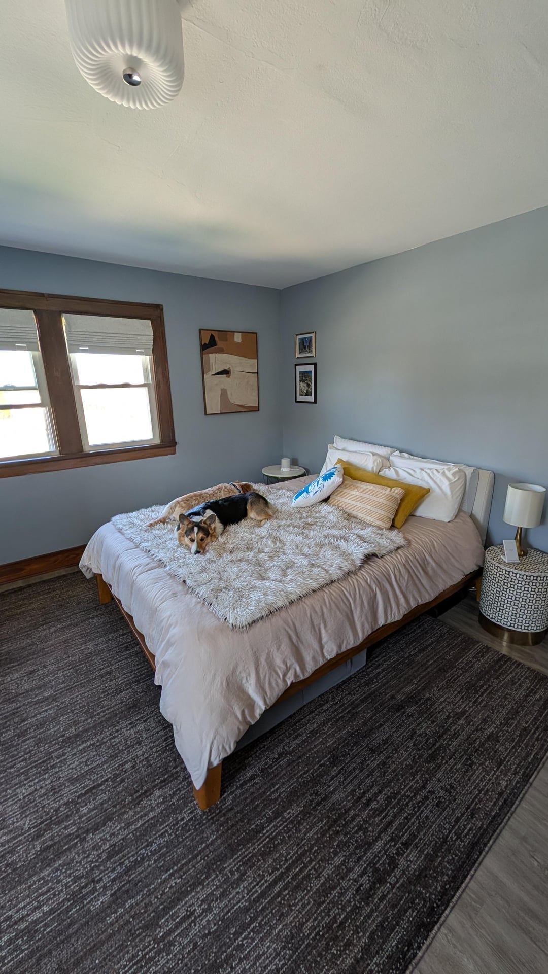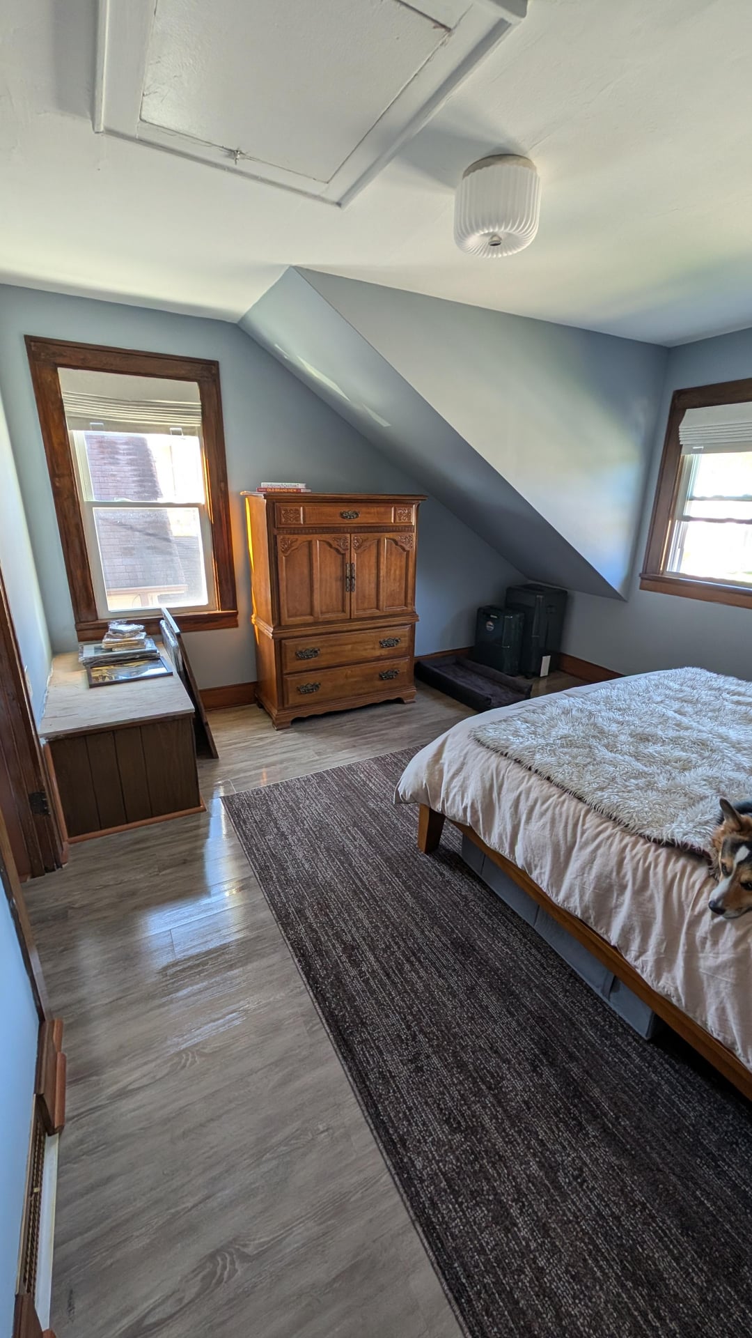 I like the idea of a big fluffy cushion on that box since you can’t remove it. Love the color of the room. Why do you have to do anything with the sloped ceiling? Put a picture on the flat side and call it a day.