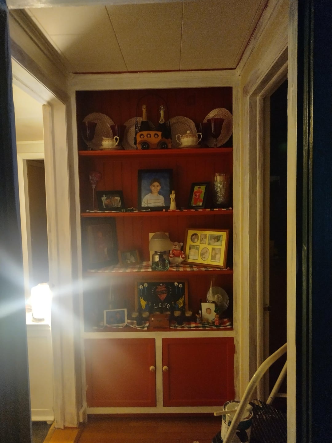 It started off all green and orange door frames, etc. Changed to all white door frames, tan paint and a mixture of colors to make paint for bookshelves. Better?? Or no??