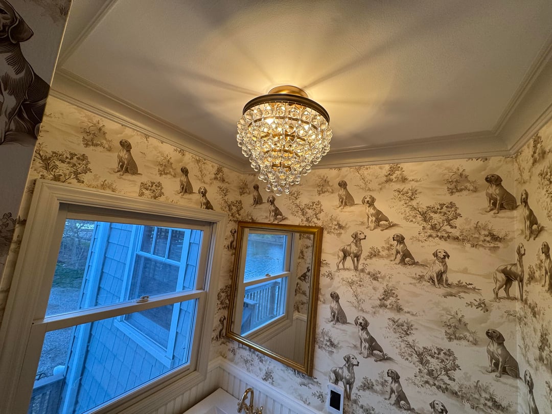 Nothing, let the paper be your art. Powder room looks great. Nice job.