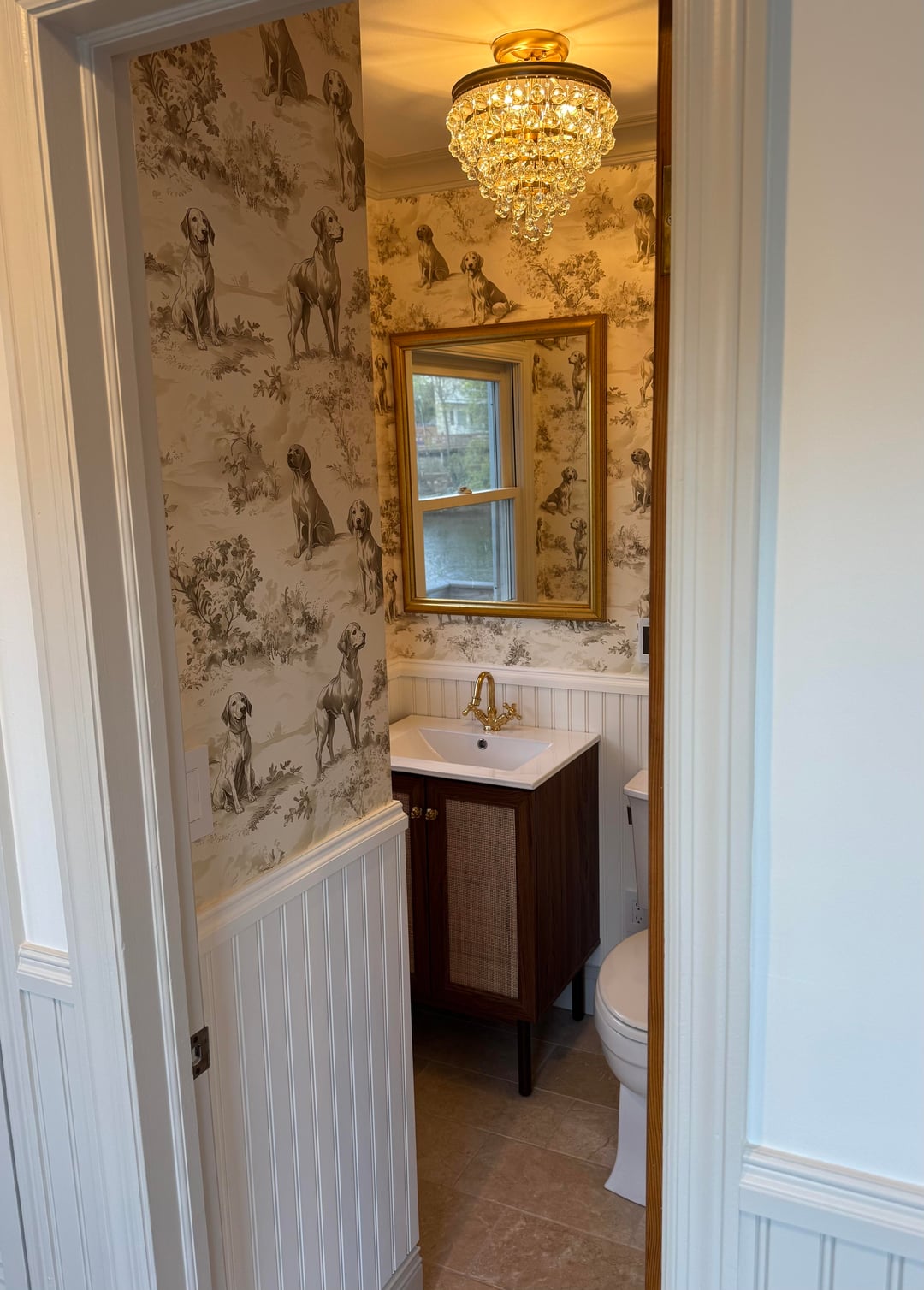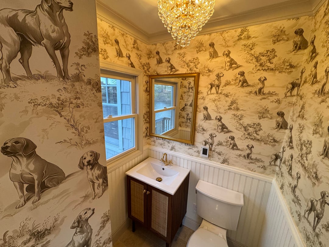I think you could leave it blank and let the wallpaper shine! Very cute 🐶