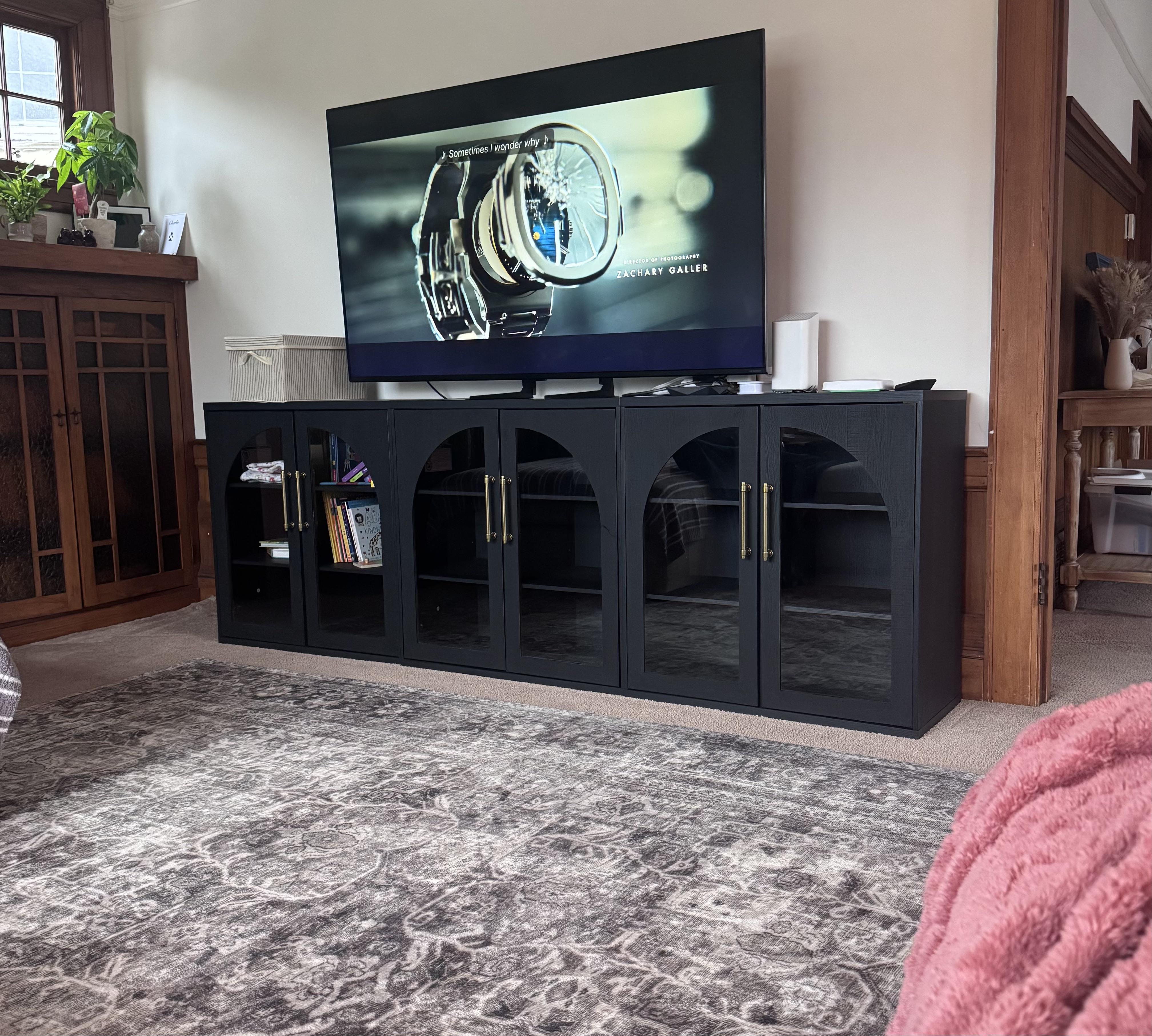 Nice setup! I’d go with some small plants in those compartments – maybe some pothos or snake plants that don’t need much light. You could also do a mix of decorative boxes or baskets for storage plus some framed photos or small art pieces. I keep my gaming controllers and random cables in similar cabinets, but they look way better when you add some texture with woven baskets. The glass doors will show everything off nicely while keeping dust out. Maybe throw in a small decorative bowl or two on different levels to break up the visual weight.