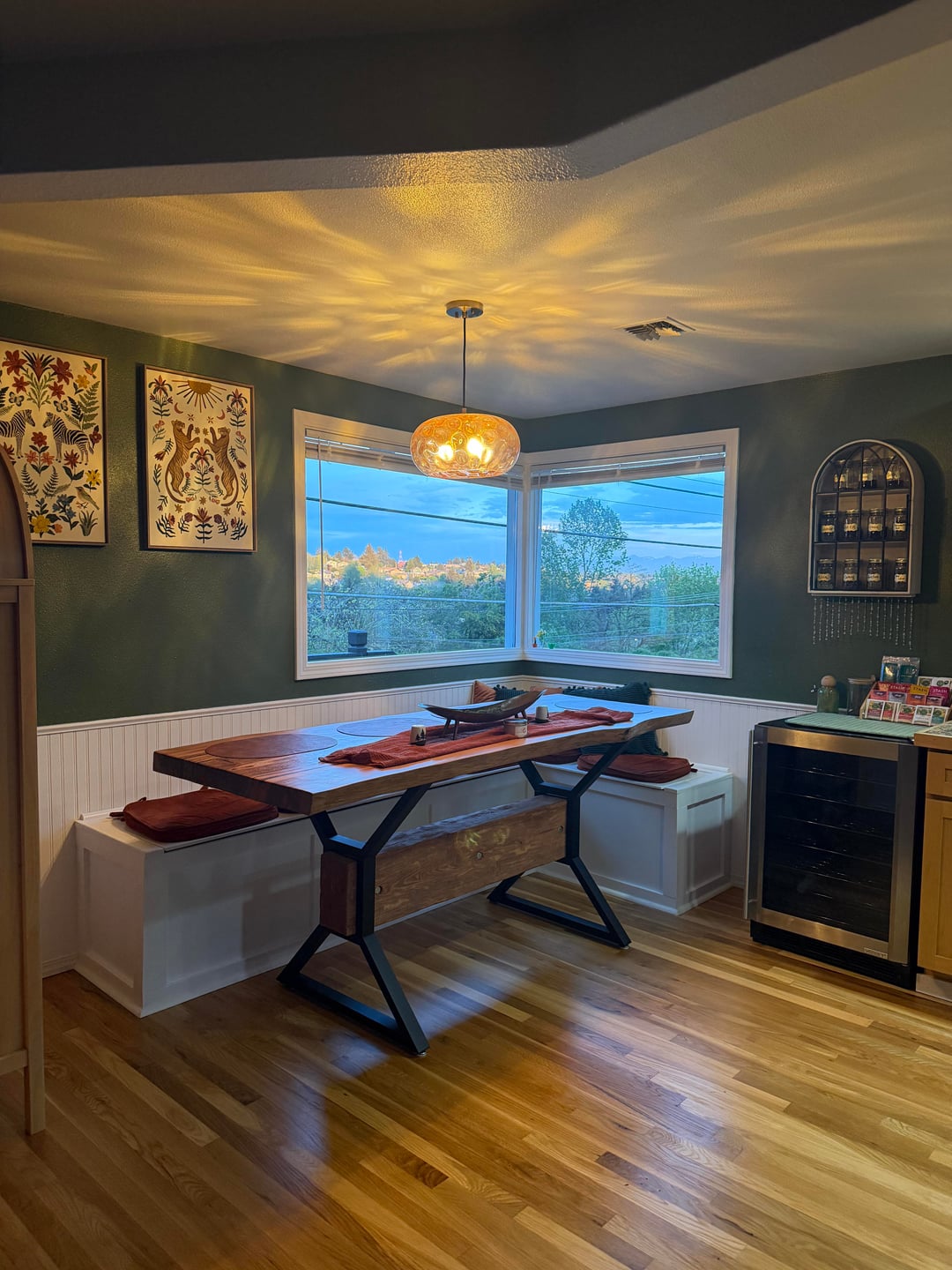 I really like the wall colors downstairs. It feels warm and cozy. Pull those burn orange chairs off the wall a bit and make them sorta look at each other