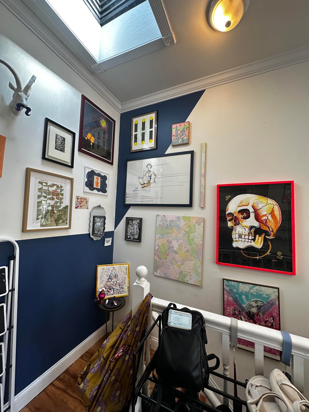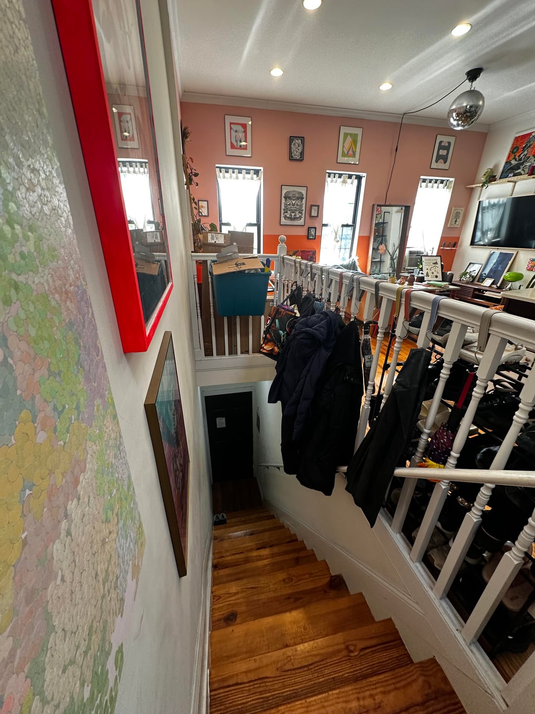 Your top of stairs is gorgeous, just keep that gallery wall going down the staircase. Same frames, same vibe, let it climb with the steps. Problem solved and the whole apartment feels connected.
