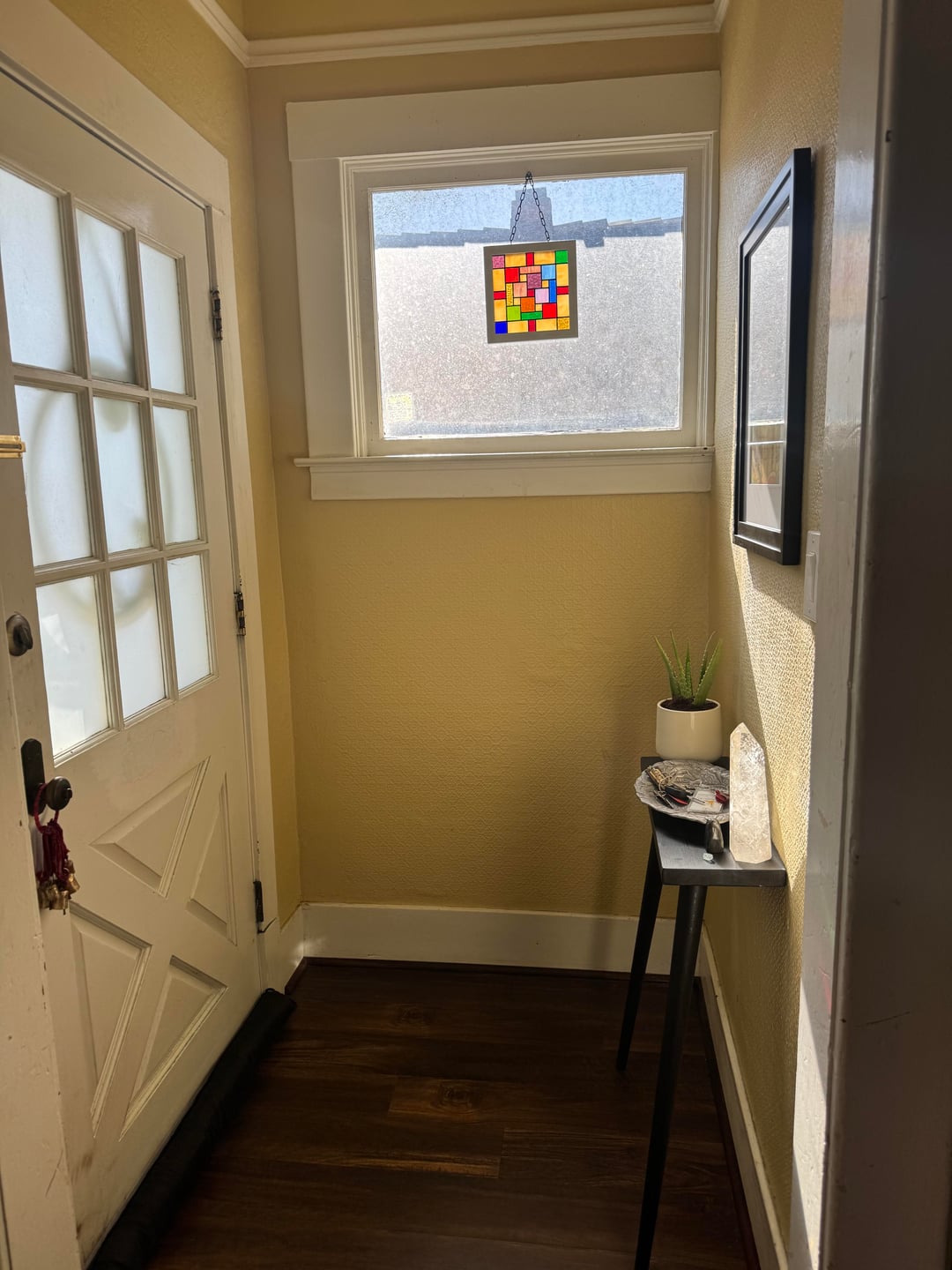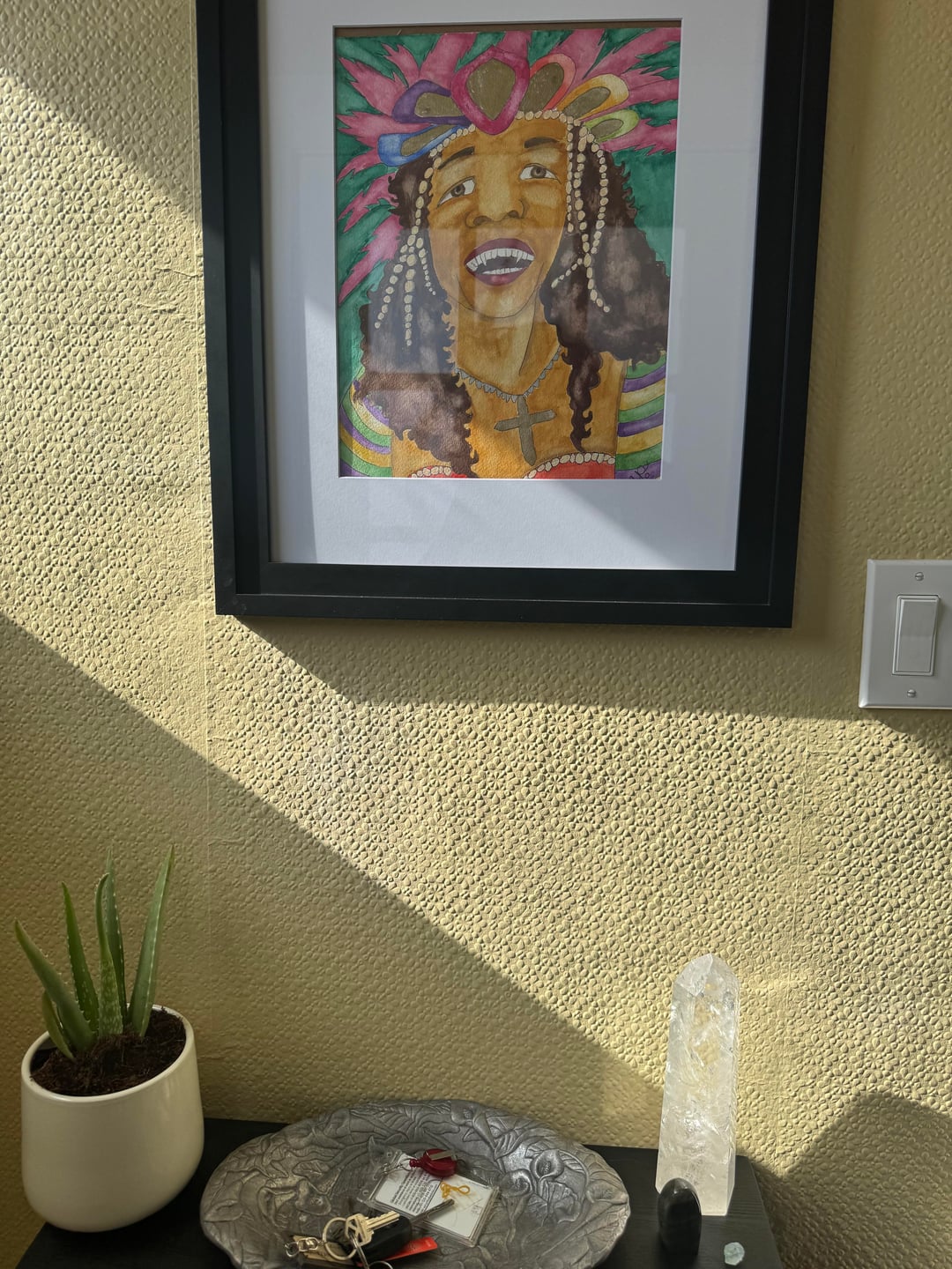 Everything else I shopped from my home: the painting by a friend's mother, the stained glass, the pewter tray, the crystals. The plant is a placeholder for one thats less spiky (and needs a push from the edge).