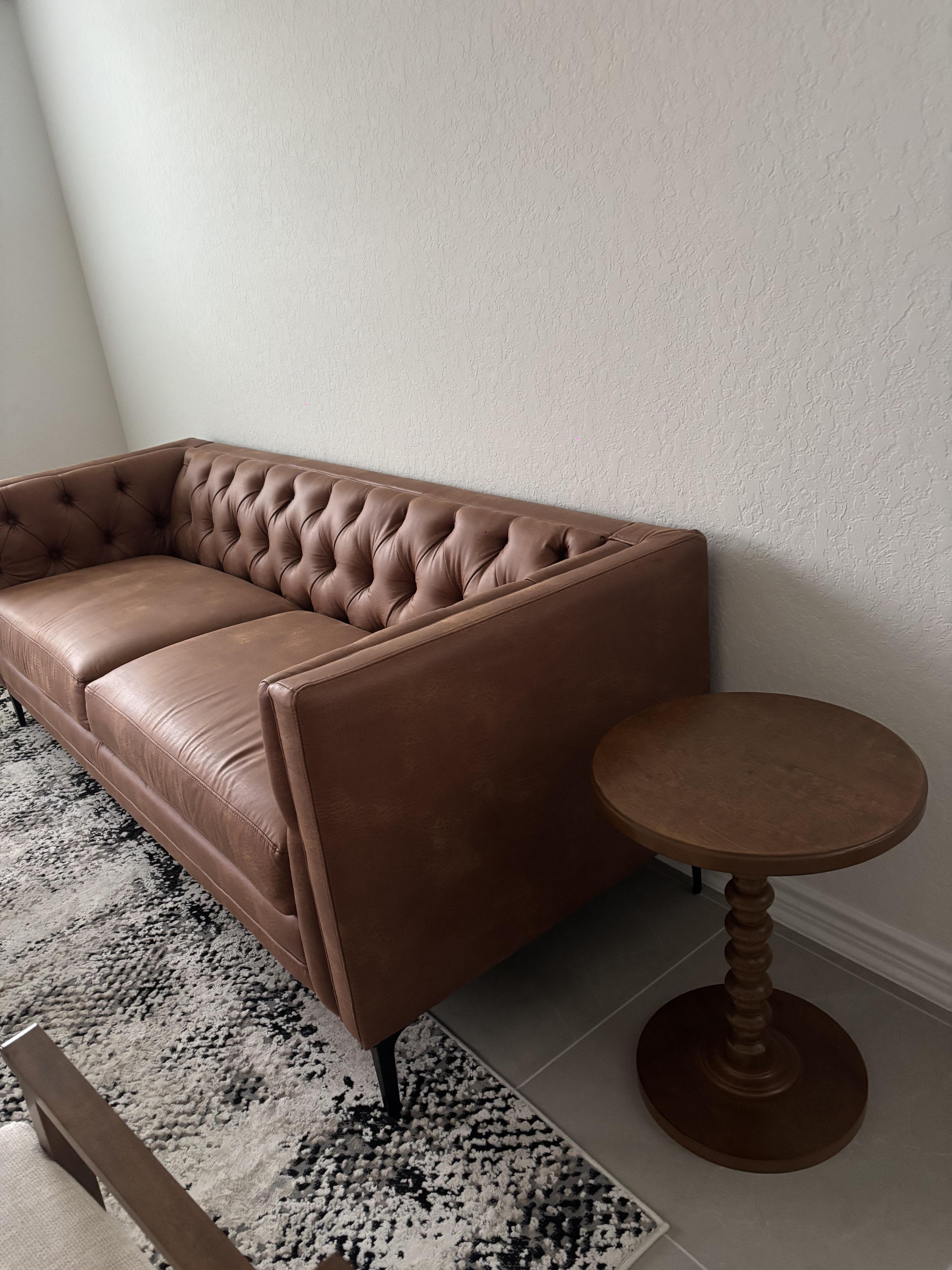 Something with clean lines would work nice with that modern leather couch – maybe a table lamp with ceramic or metal base in warm tones to match the wood. The round table has good proportions so you dont want anything too chunky that will make it look crowded