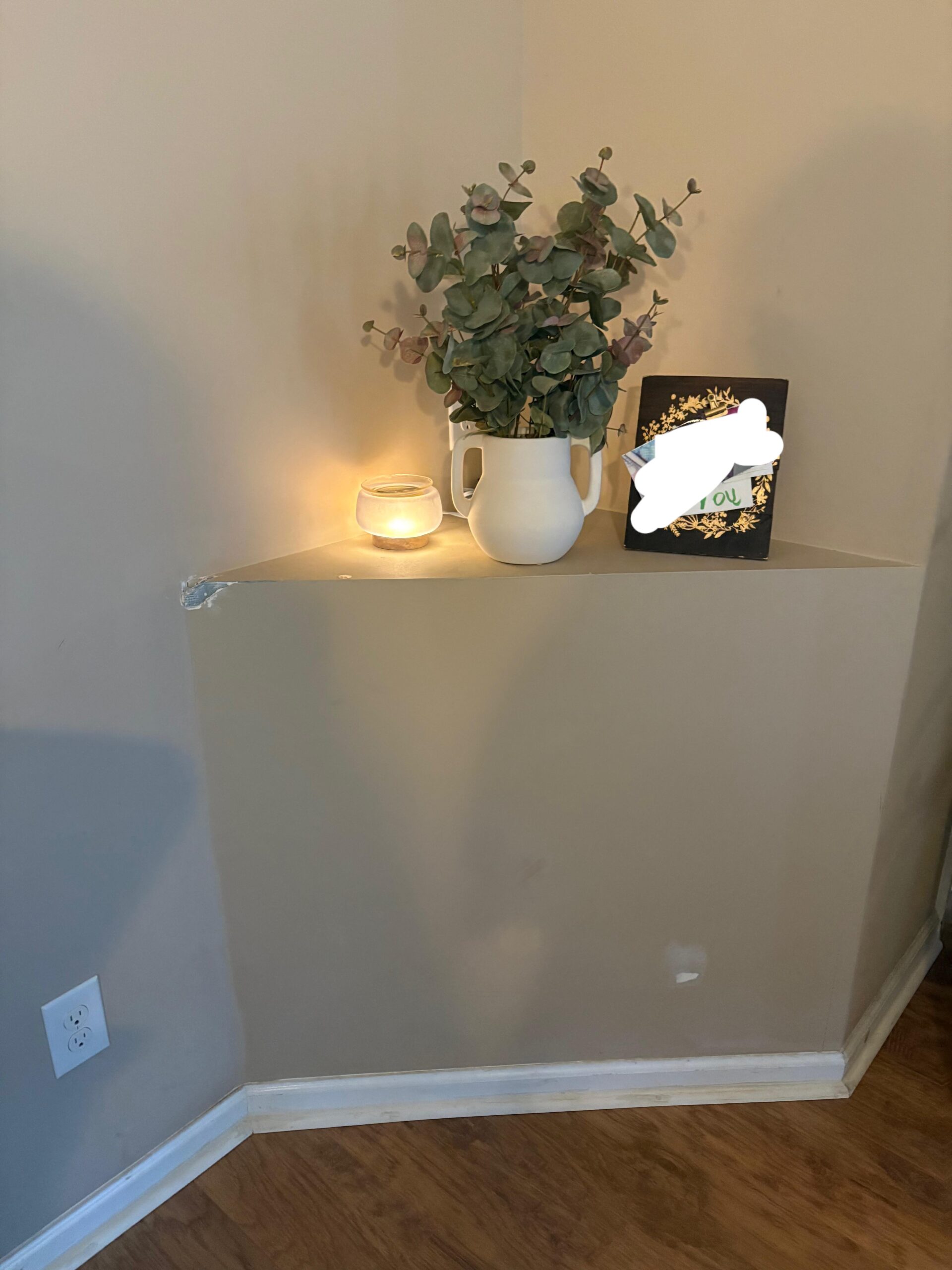 Looks built for a lamp to plug in there and/or use as a “charging station” … if you can fix the damaged corner, get a lamp large enough to hide the outlet, and put a trailing plant llike a philodendron there I think you will like it better. Try for color accessories (the pot for the plant and the lamp and shade with some colors instead of white and it will help it look less “batched together to hide the outlet” and more intentionally designed.
