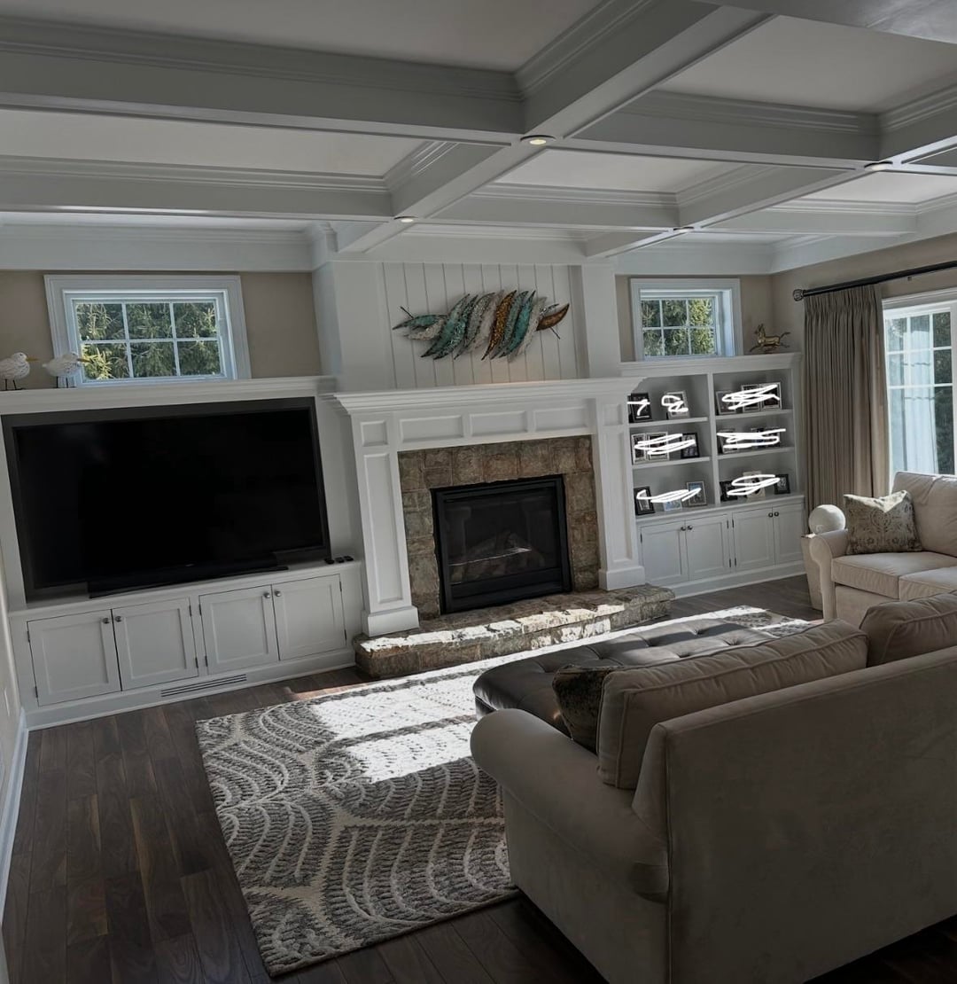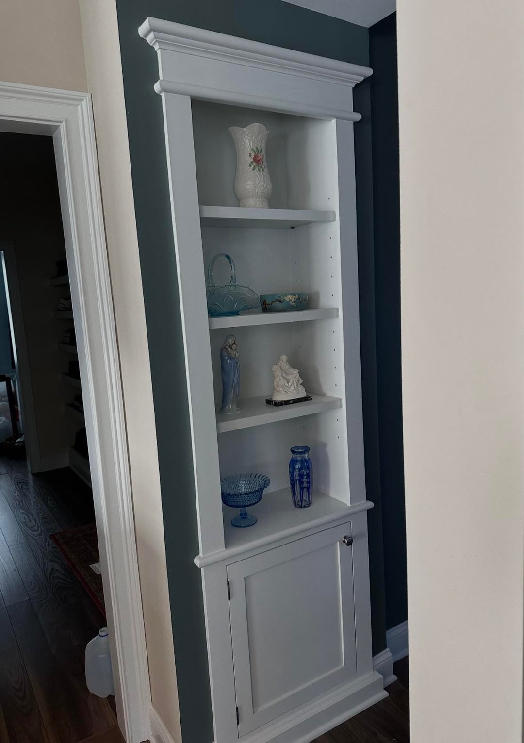 Please help me figure out what items I need to buy for these shelves – 1) family room, right side of the fireplace 2) dining room/hallway built-in