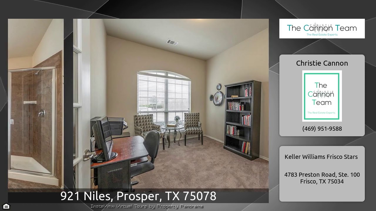 The Virtual Tour for the property at 921 Niles, Prosper, TX 75078 listed for $275,000: Other homes for sale by Christie Cannon of Keller Williams Frisco Stars: Prosper gem! Charming single story front garage with peaked roofline. Ceramic Tile entry to Formal dining spacious enough for your extended table and buffet! Pass through to kitchen makes for entertaining ease. Eat in kitchen with island and plenty of counter space! Abundant storage and open concept floorplan! Study can be used as 4th bedroom! Large living room highlighted by cast stone fireplace! Secluded Owner's Suite with french …