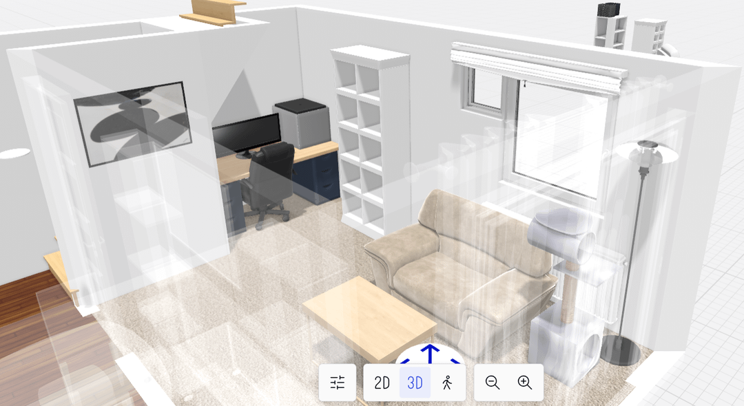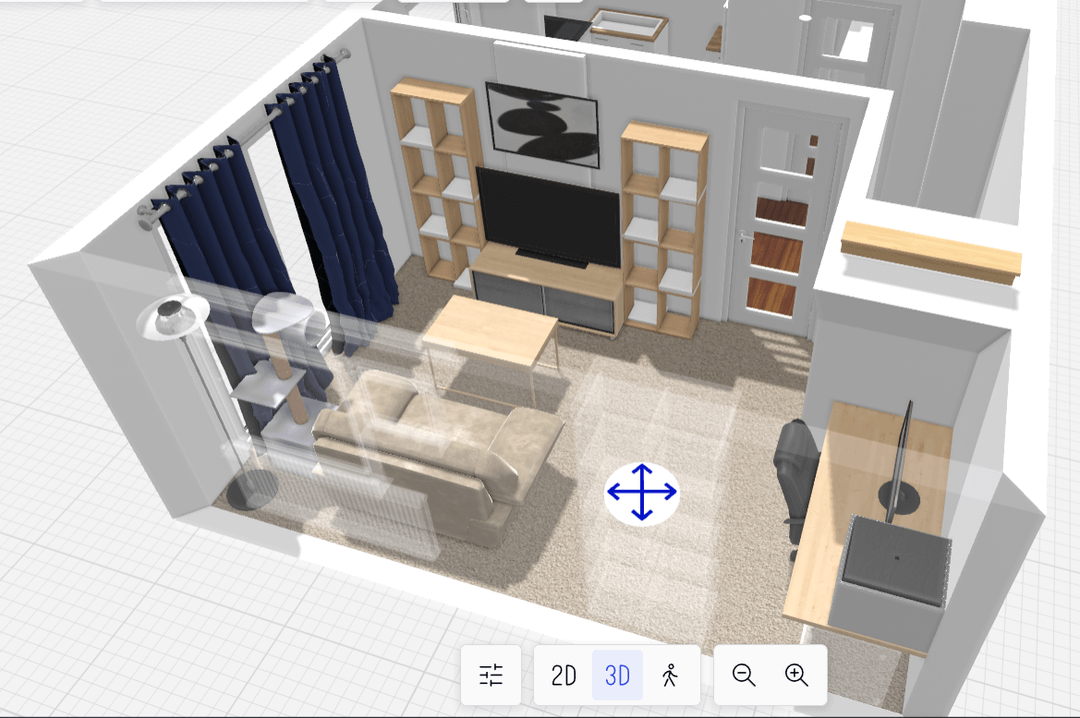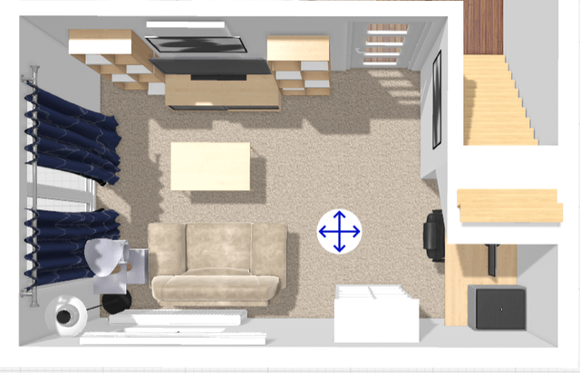 • There is a spacious alcove on the side (175x90cm) that I would like to use for a desk + 3D printer setup. For that I've just bought 2 IKEA alex units (in black-blue) and plan on getting a worktop to match the ash wood of the furniture. I haven't bought any curtains or blinds yet but I was thinking to try match the colour of the drawers to the curtains so they don't look out of place, but I feel like dark blue blinds on the windows behind the sofa might look odd. Would blue curtains for the patio doors and white blinds for the windows look better? The main colours of the room so far are white and beige so it could use a splash of colour somewhere.