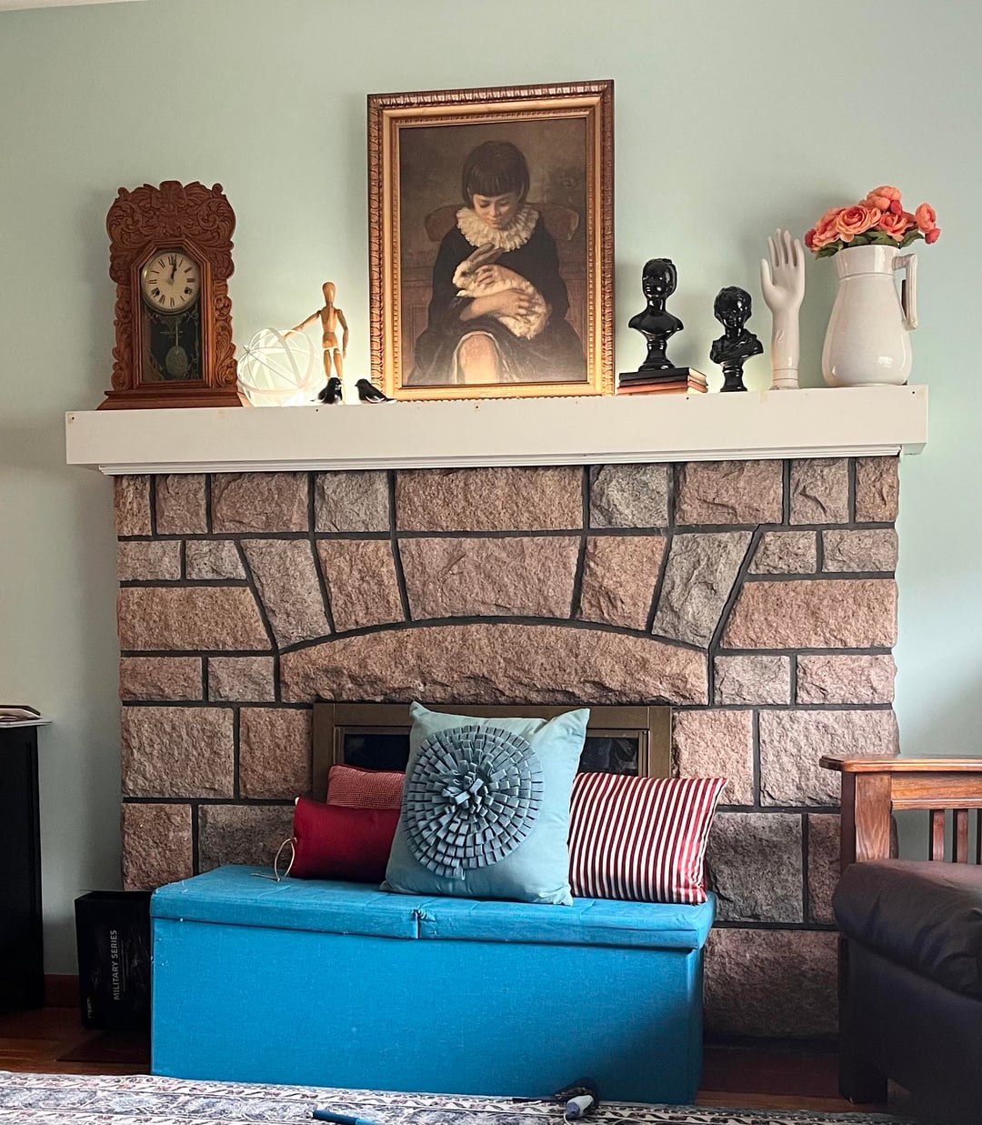 Add a large mirror or piece of art above it. Again, distract from the “stone” but still make it a “moment” like fireplaces are intended to be.