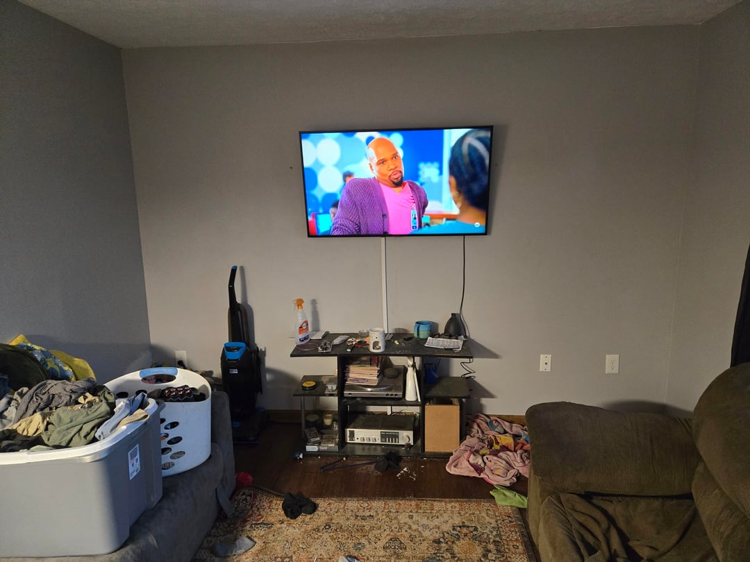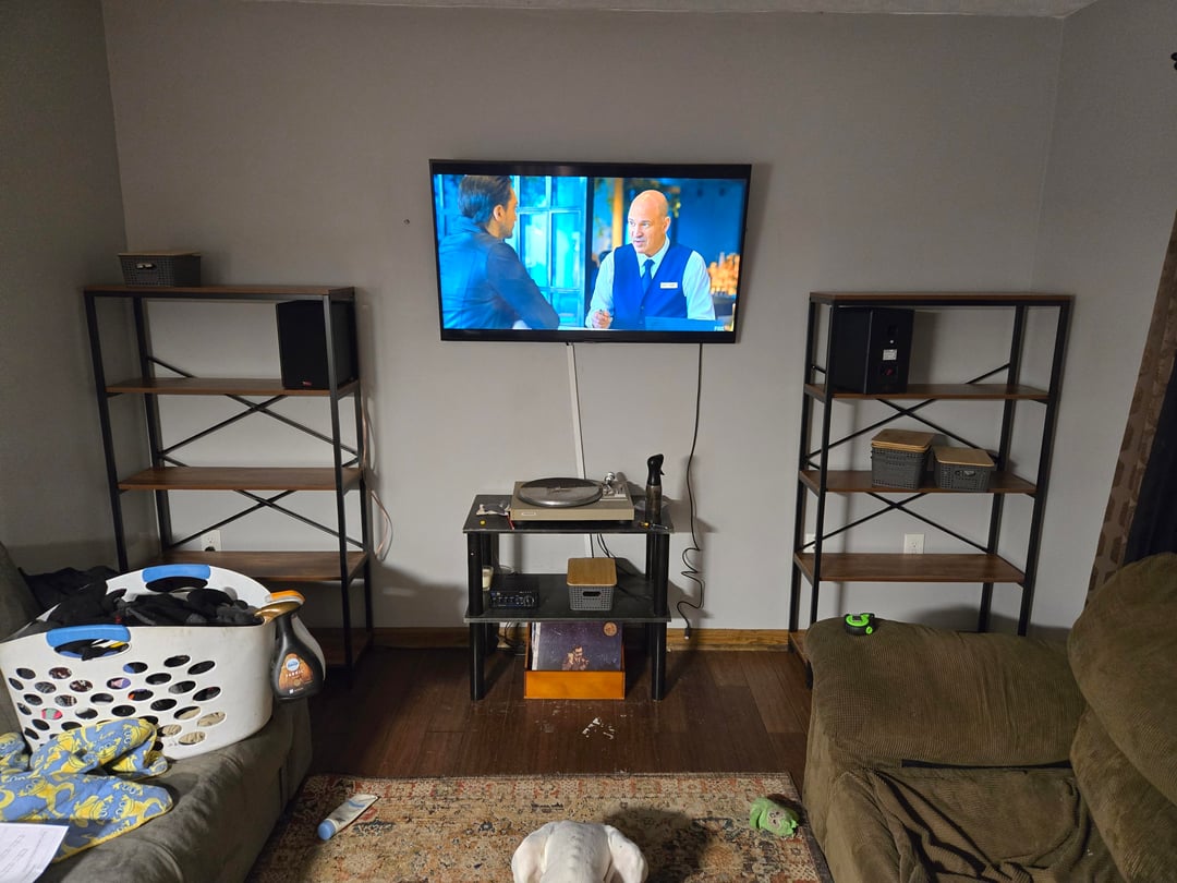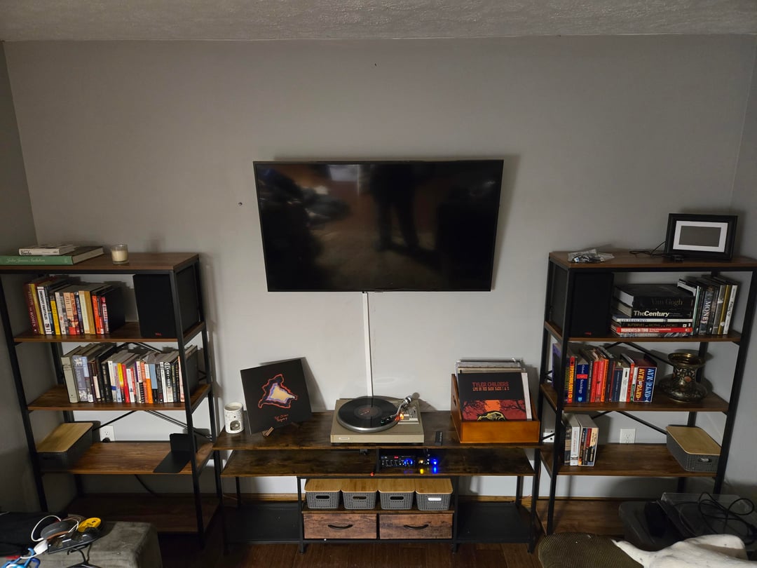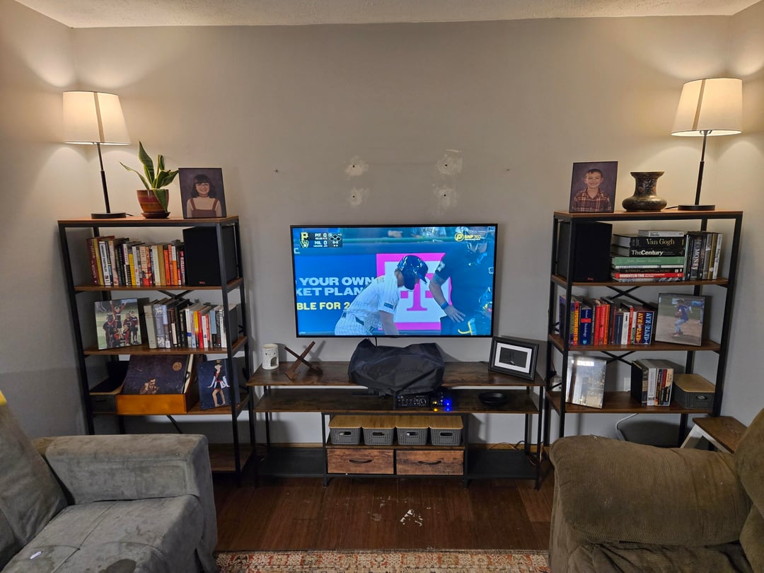 Looks great!,what about some shelving,you dont have to hang anything like pictures above your t.v.,,what about around it? Or what ever you want,my friend hung his guitar,a violin and mandolin,looks great,whatever you like,,do you play music,or sports,or games,hang something that speaks to you,.