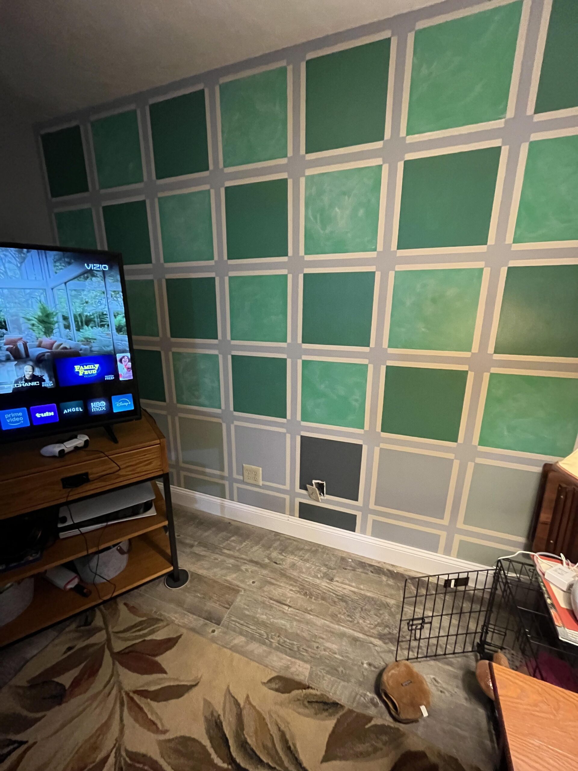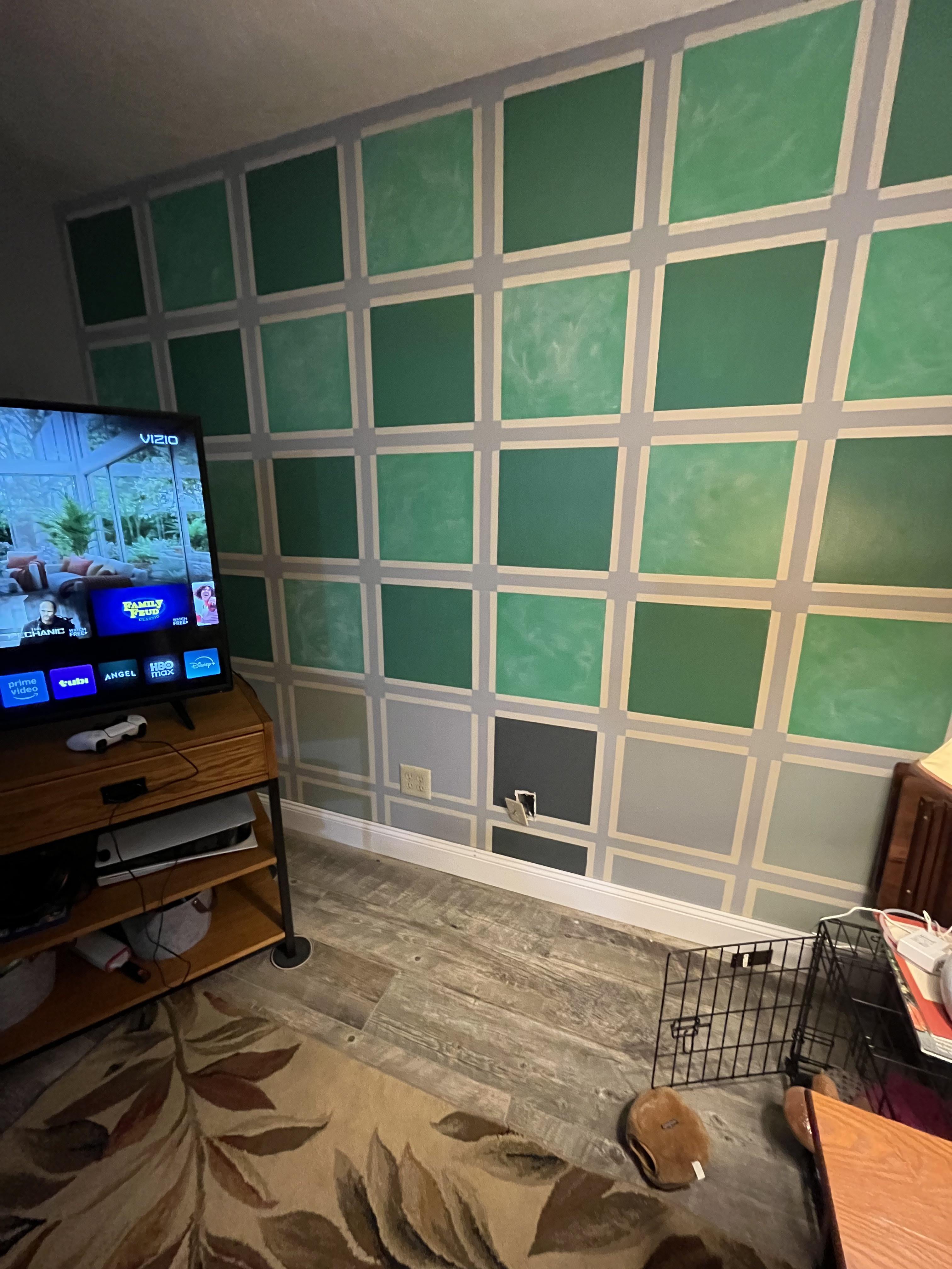 I like this unique paint job in our family room (it complements the fireplace on the other wall), but *surprise* when the previous owners moved out and took their couch, it turns out they didn’t do the whole wall. They didn’t leave extra paint and I can’t match the exact color of the darker green (it’s years old on the wall, so even if I knew the color it wouldn’t be exact). Then I think the lighter color was created by them just adding white to the dark green paint.